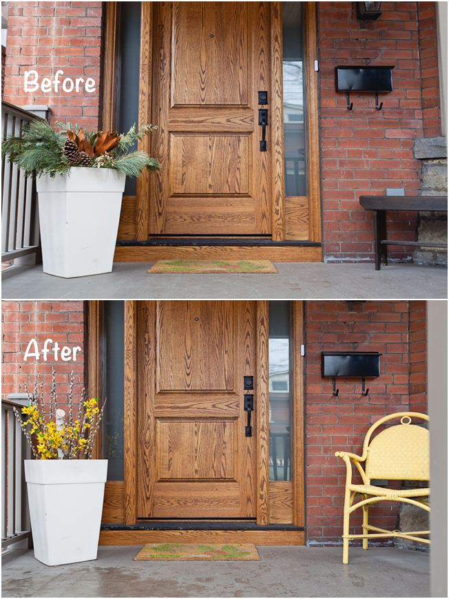 I then decided to switch up the brown bench for a yellow chair, which I normally save for summer, however I feel that additional pop of yellow really helps to brighten things up and makes the planter stand out more.