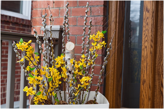 I wanted the planter to look bright and pretty for Spring, but without looking too “Easter,” (so no eggs, ribbon, etc.) so the best options were Pussy Willows and fake Forsythia. I also had a birch tree branch and some plain brown “twiggy stick things” left over from previous holiday planters (I hold on to all of this stuff – you never know when it can be re-used for something else).