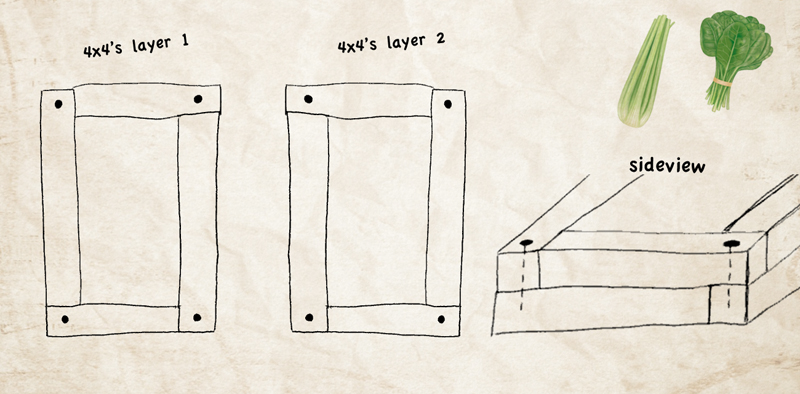 Step 3: lay down your first “layer” of 4×4’s (2 in the length and 2 in the width). Now hammer your second set of 4×4’s on top using the large hammer. This likely will be a little bit of hard work, but hey…you’re knee-deep into it at this point, so don’t give up!