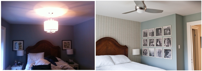 A before & after shot. We’ve also added wallpaper to the back wall and swapped out the chandelier for a fan. Progress, my friends, progress….