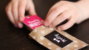 Invitation: I designed a set of four 2″ x 2.5″ cards, including invitation information, date and time as well as a map. I made sure when creating the cards to leave enough room at the top to hole punch a circle. Next we used pink baker’s twine to attach the dog bones to the invitation. I found the pink twine at a great online supply store called Greenmunch. The twine was available in many colours.