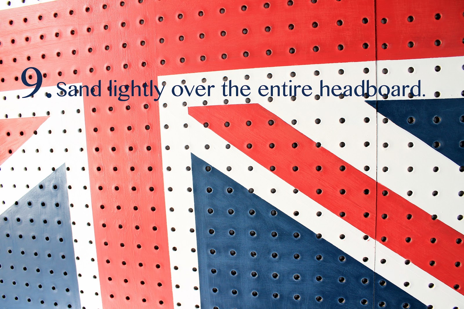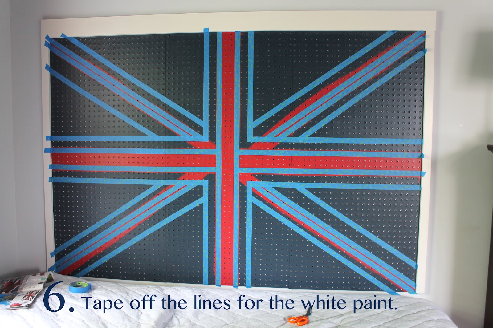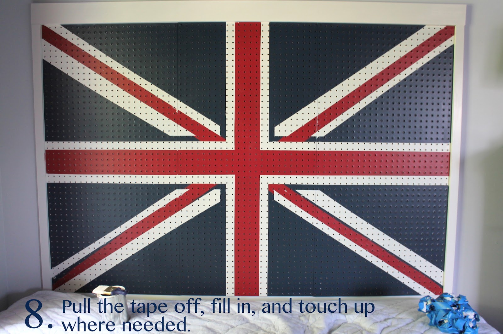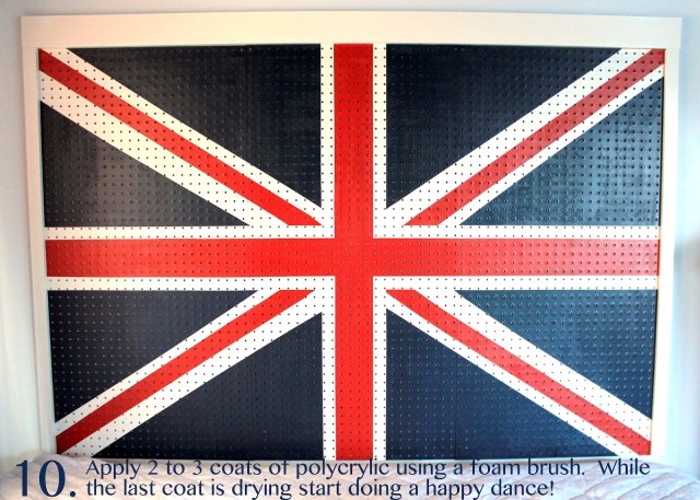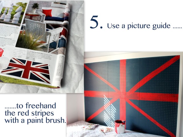 Carmel used this Grandin Road catalog as a guide for painting the Union Jack. You don’t want to overload your paint brush when you’re painting pegboard. The brush needs to stay pretty dry, so you don’t get globs of paint in the tiny holes.