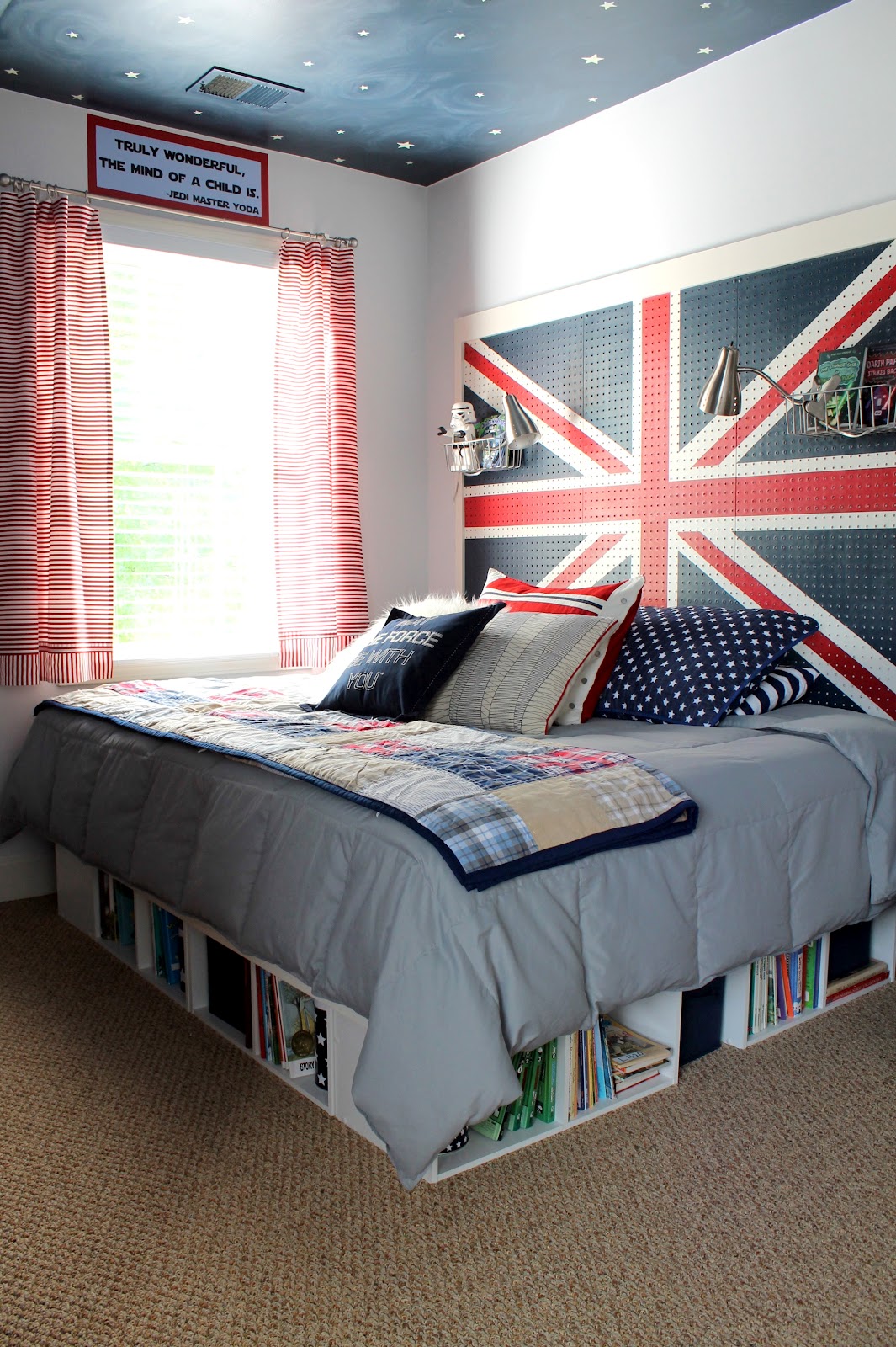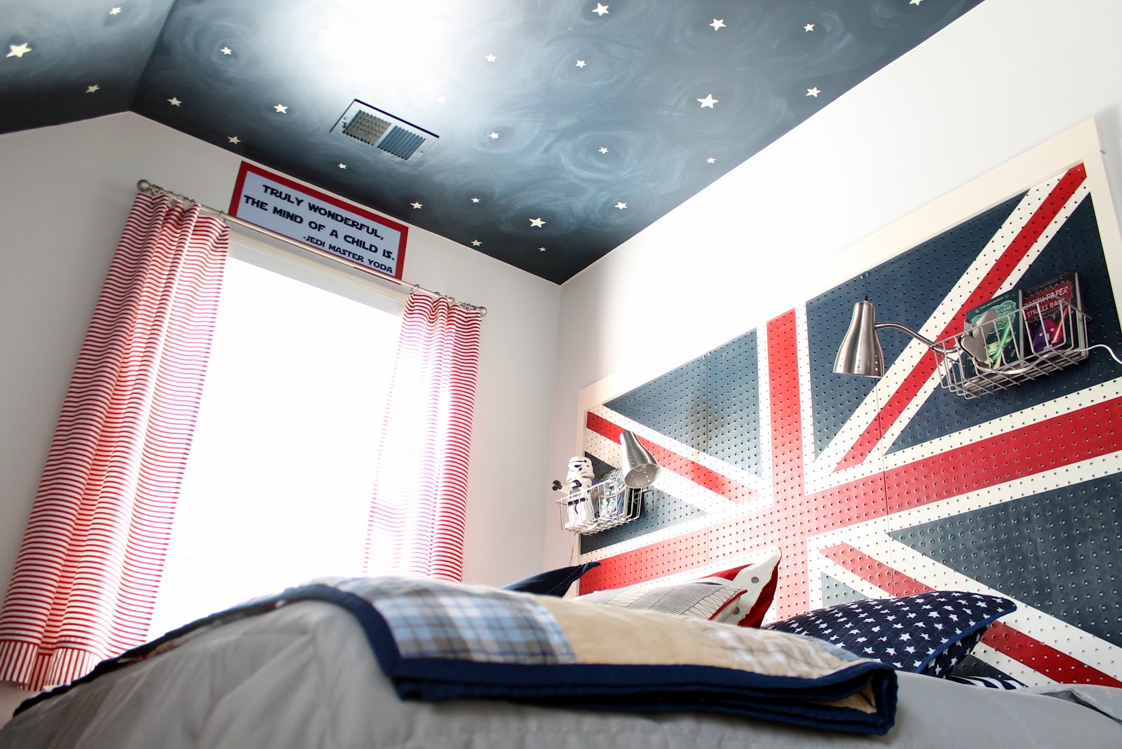 The room has a Star Wars thing going on (as requested by her son), but Carmel thought it needed a little Union Jack action.