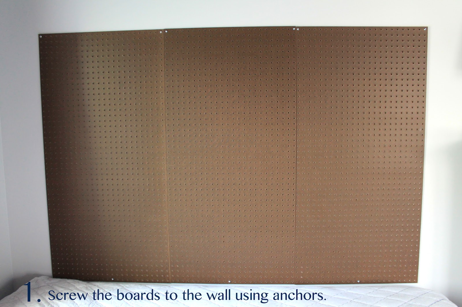 If you’ve ever used pegboard for its intended purpose then you already know that you’ll want to leave a little space between the screw and the anchor. Basically, you don’t want them totally flush with the wall because you want to have space to use the peg hooks/ baskets.