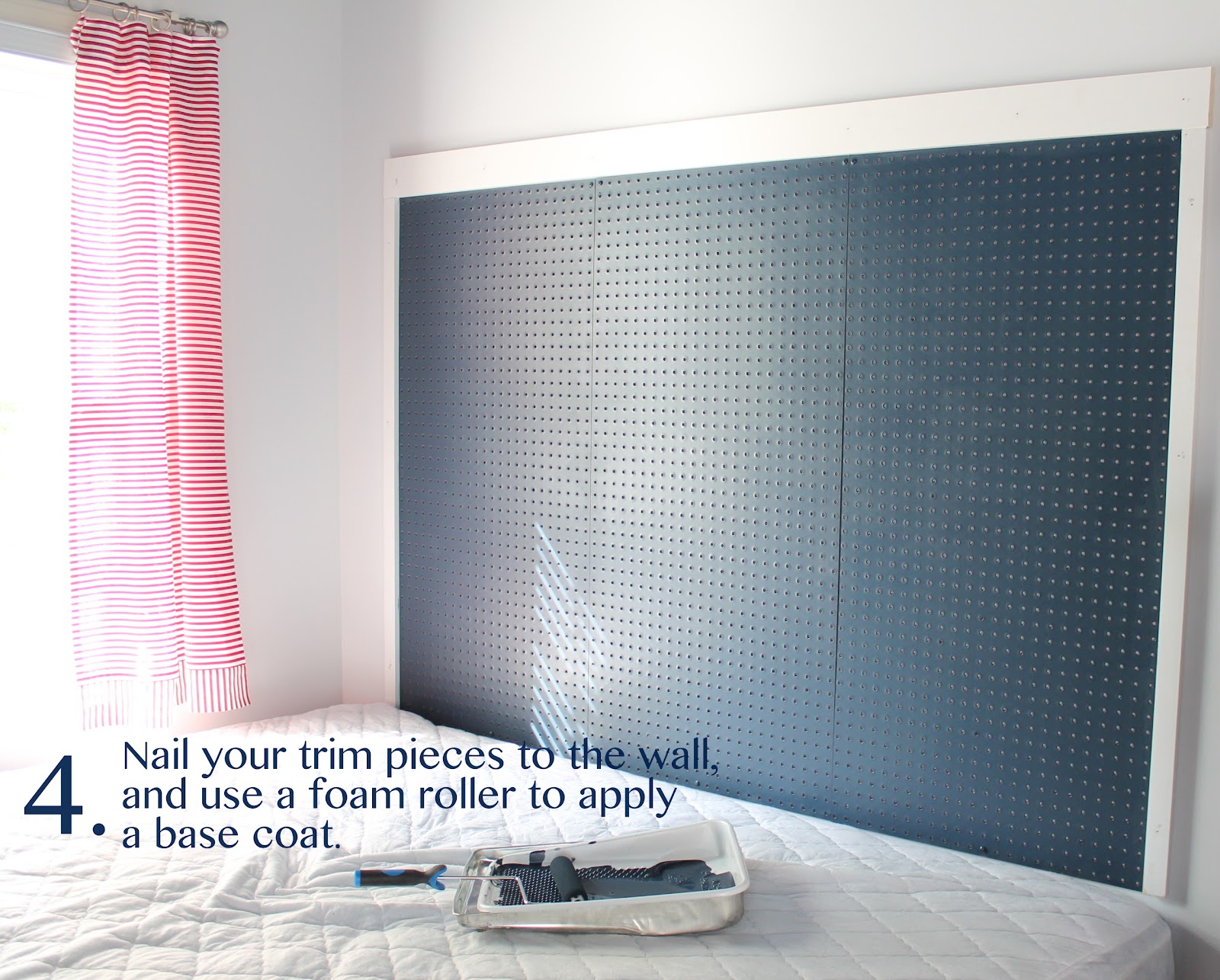 Project Costs (pegboard headboard only): The pegboard comes in many different sizes and it can be painted. She bought three boards for about $35 and some pre-primed wood trim to frame it out for around $15. She already had the paint, so this headboard cost around $50. Apart from being nice and easy on the pocketbook, it resolved problems 2 and 3 above, and it only took about 10 relatively simple steps to get from point A to point Z!