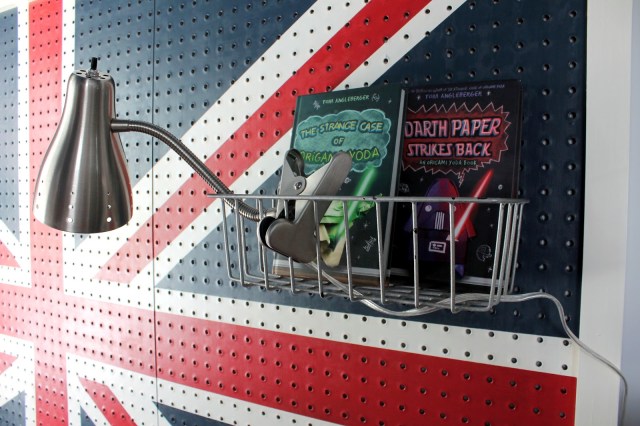 She used pegboard (Lowe’s) to create a headboard, so that she could use these baskets (Home Depot) to hold books as well as these nifty clip-on lamps (Lowe’s).