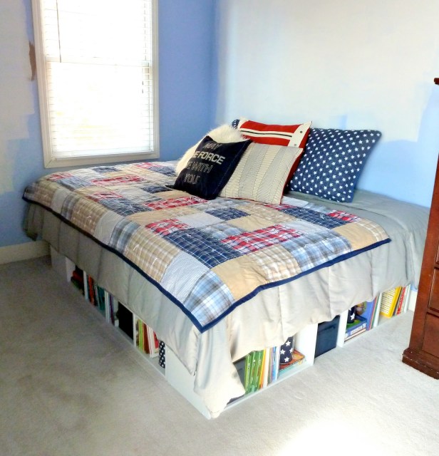 1. How could she make the queen size bed (they already had) fit in his somewhat small room and still have room for some kind of bookcase/storage for all of his junk stuff?