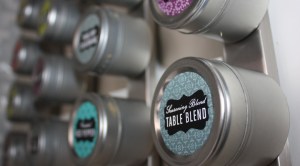 First, I designed the spice jar lids, picking up on the eclectic colours of some recent plates I had hung in our dining room. I have attached my designed spice lids here if you want to use mine (enjoydesign.ca_spice_lids), but you can get creative customizing yours to match your own kitchen. I created mine rotating six colours in alphabetical order. Each lid should measure 2.375″ in diameter. Print and cut out lids (don’t worry about getting them perfectly round, the edges are hidden when inserted). Next, pop out the plastic top from the spice jar, place your printed lid inside the lip, and pop back in the plastic top.