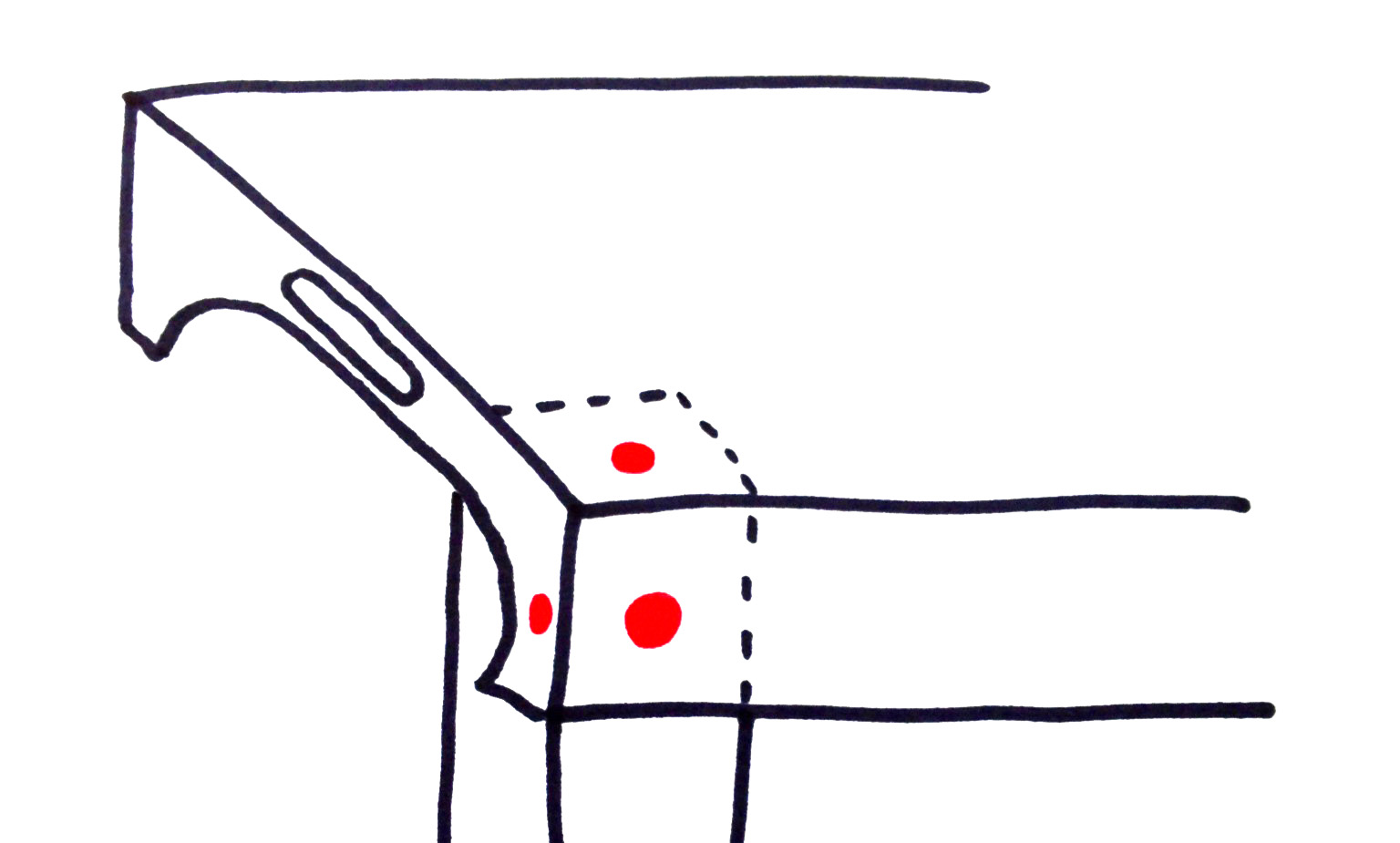 Get your tray and screw legs onto tray. Do not use nails as they create a wobbly table. Screws are much better in creating a very snug connection between wooden pieces. If your tray is made of very thin wood, I would recommend you pre-drill the holes for the screws to avoid the wood from splitting when you put your screws in. I secured my legs on each surface that had contact with the tray, so on 3 surfaces (2 on the side and one on the top) — see sketch.