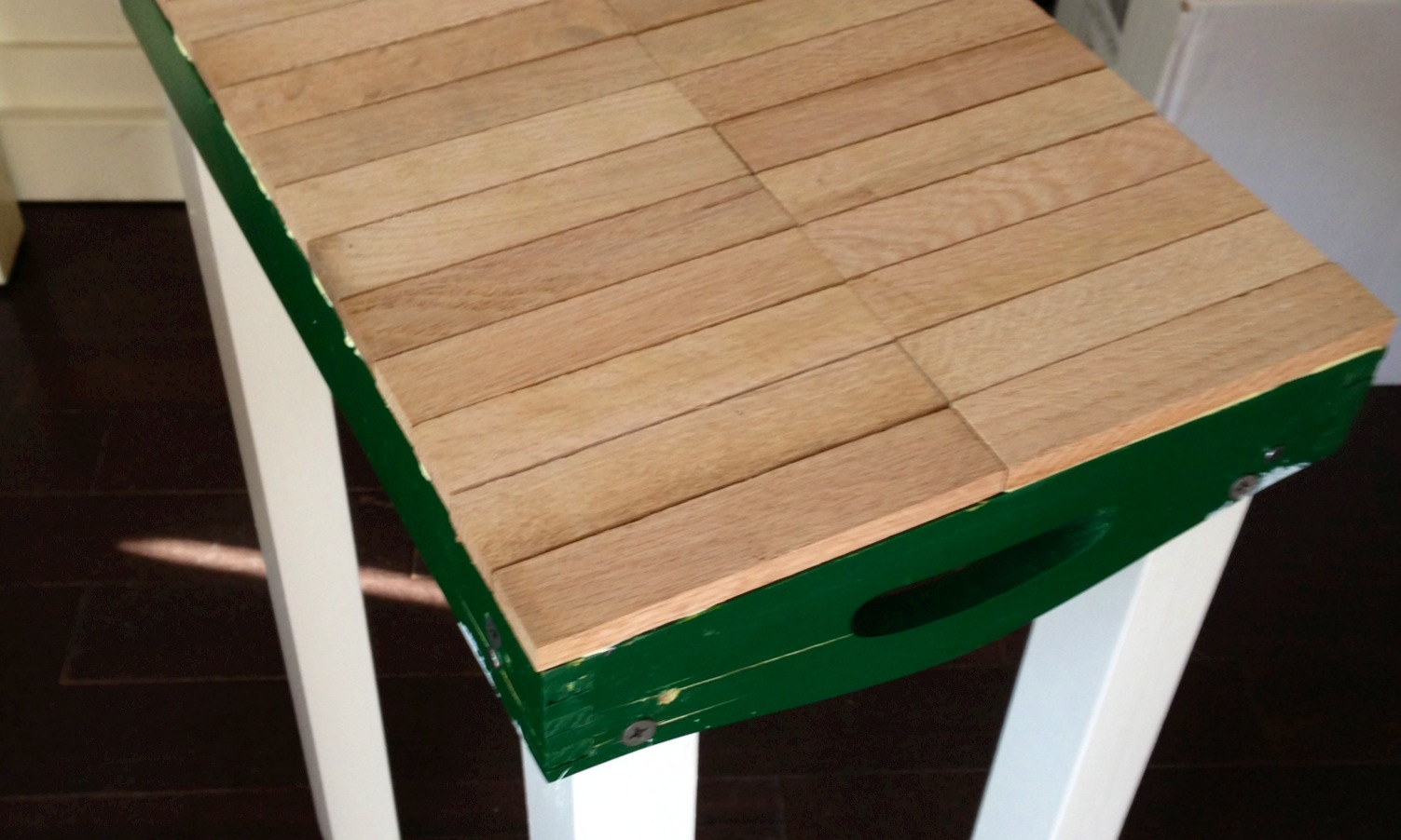 When the legs are dry, put your table upright and let the fun begin. Use a good quality carpenters glue and start gluing your shims on the tray. I did the top first and let those dry for a good hour before doing each side and letting each side dry first before starting on the next. So the whole shim gluing portion will take a few hours, mainly dry time.