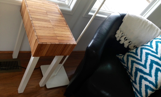 A few weeks ago, I ventured into the spider-infested crawl space under my front porch (a place I have not dare to go yet since we bought the house 3 years ago). The very dusty treasure I found was a box filled with wooden shims. Imagination sparked, determination fierce, I set to work and created a small, custom side table I had been looking for but not found for our new beach cottage.