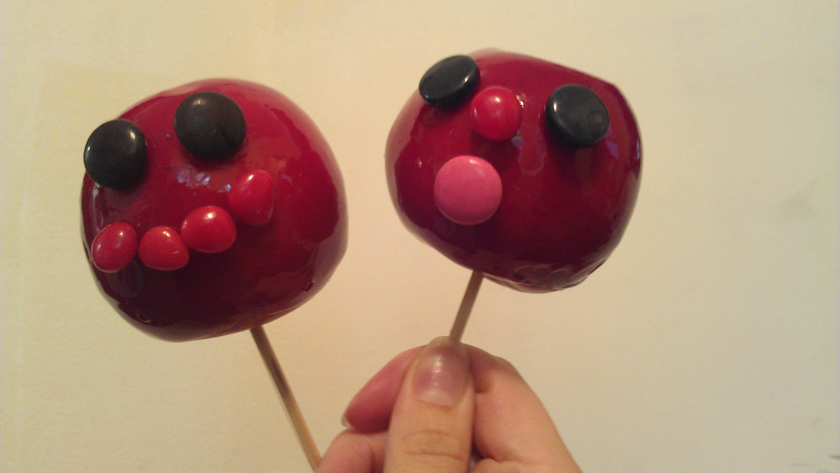 4. When your sugar syrup is at optimum temperature, immediately remove it from the burner, grab your first apple, and start dunking. You’ll have to grab your pot and tip it to one side to get a good pool of syrup to coat your apple. Do this quickly and then put your candies on to make a face, or just roll your apple in whatever you’d like – coconut? sprinkles? nuts? The possibilities are endless. Just be aware that there may be a bit of slippage with the candies, so your smiling candy apple character may end up wearing a bit of a frown by the time the coating hardens.