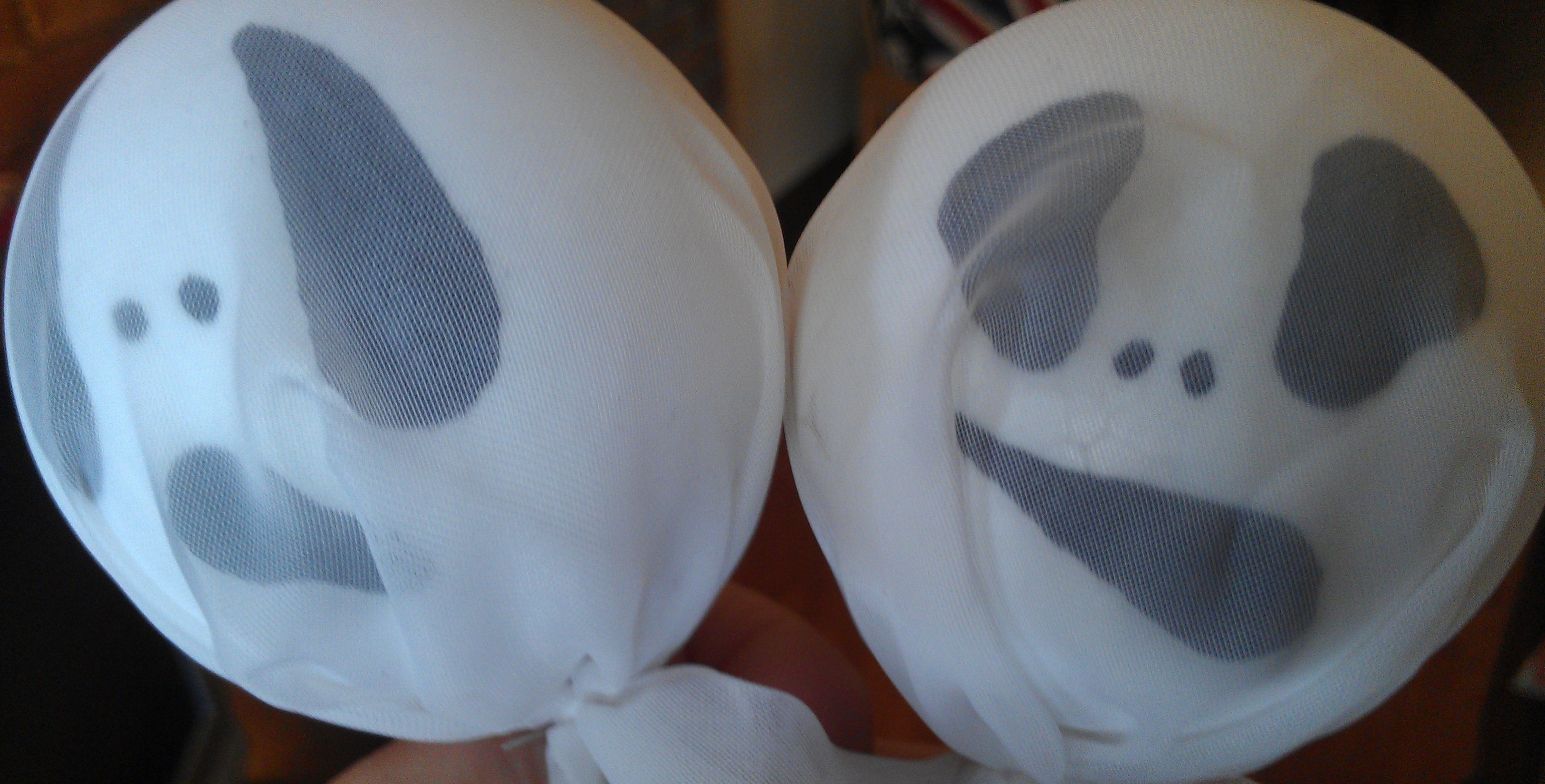 Put your styrofoam ball (top of the head) in the middle of the material, gather it up and wrap and tie some white thread at the bottom of the ball, securing the material. Make sure that you haven’t obscured your ghostly face with material folds.