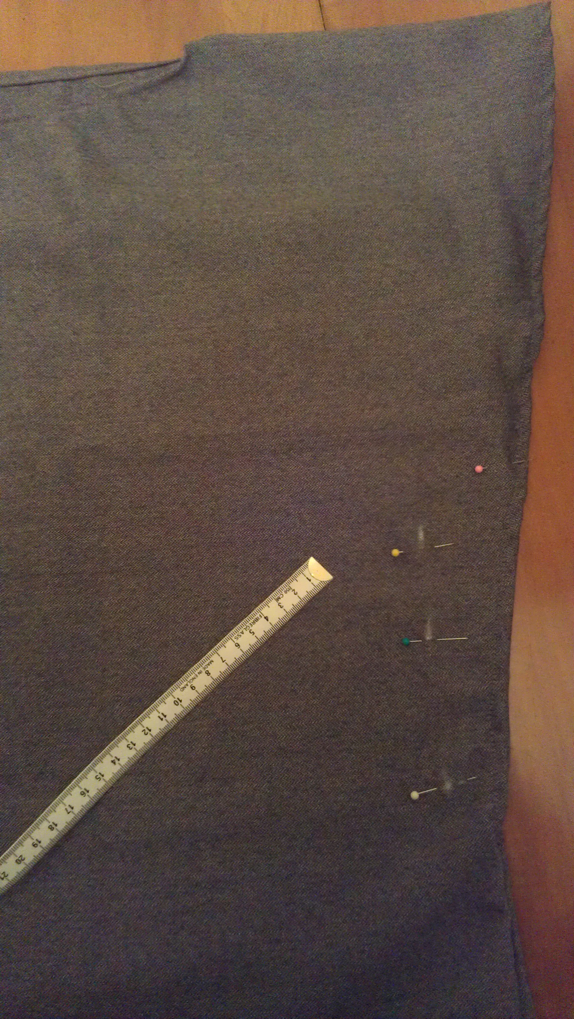 6. Measure in, equally, from both sides, where seam would work to make top fitted. Mark with chalk on right side (outside) of shirt from waist to as high as you wish for bottom of sleeve.