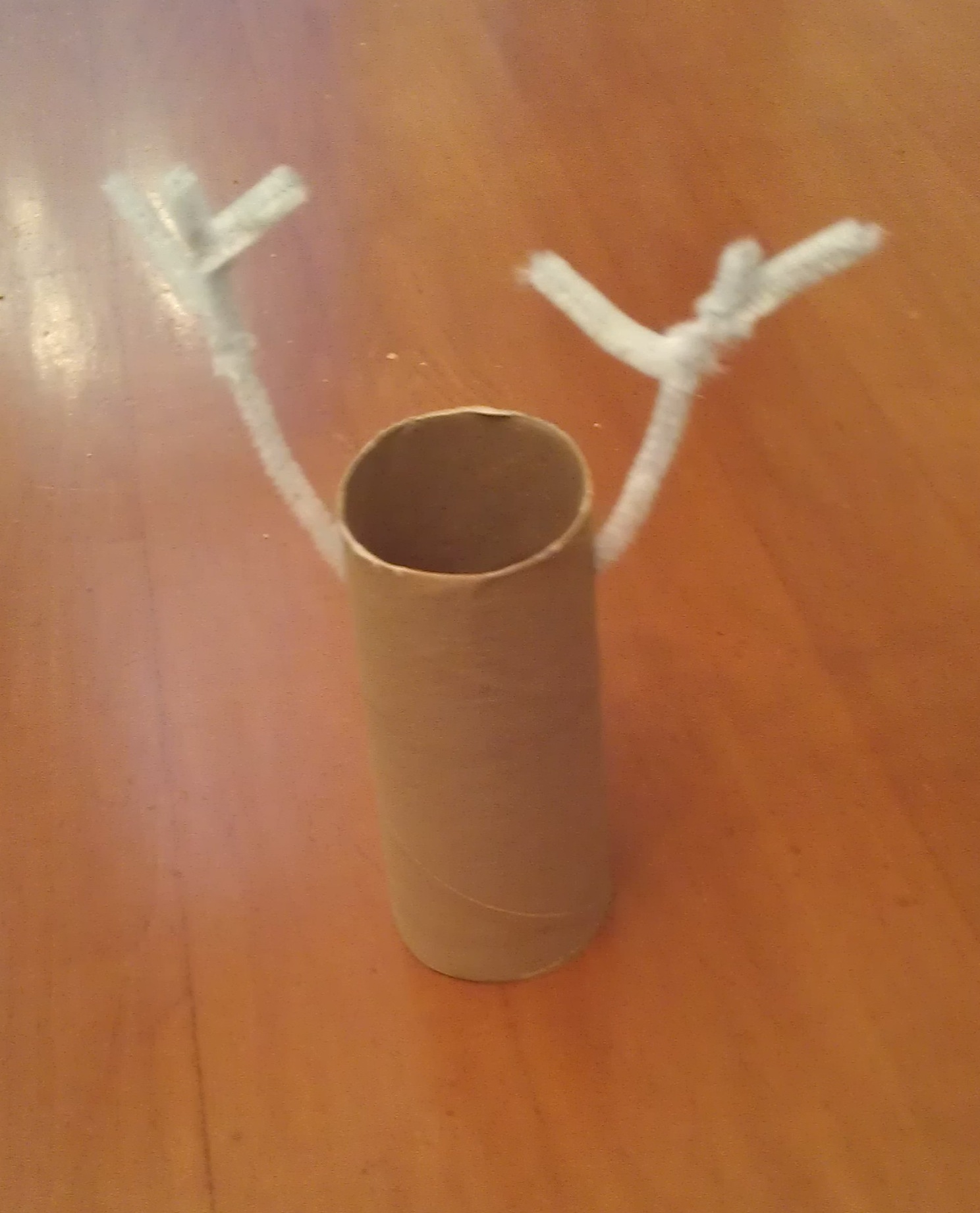 Step 2: Then, the kids cut their pipe cleaners to their desired length and did whatever they wanted to them, shape-wise, before they inserted them into the reindeers’ heads for antlers. We then taped them to the inside of the roll so they wouldn’t just fall out.