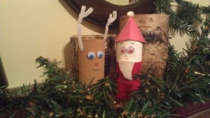Step 1: This craft takes a little bit of adult prep beforehand, and a little more help along the way. First, I poked holes in the side of the reindeers’ heads ( in which to insert the antlers). Then I painted the rolls brown for the reindeer and white and red for Santa.