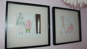 I sketched out a few ideas and then I made a trip to Michaels to source some paper. I chose fairly neutral backgrounds. I then painted, in white, scenes of the Seine river on one and some French architecture on the other. I drew in pencil the areas I wanted to paint the people. I’m not an illustrator so my illustrations did not really have detailed hands…or heads for that matter! I painted Calla’s face and all hands, legs and shoes, adding a bit of shading with a slightly darker tone on my second coat. I then cut out the clothing from my chosen scrap book paper and glued them on using a glue stick. The frames I bought from Ikea were great because they are so deep you can see the texture of the paint and cut paper through them. The matte that comes with the frames also holds perfectly a 12″ x 12″ piece of scrap book paper.