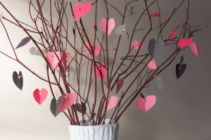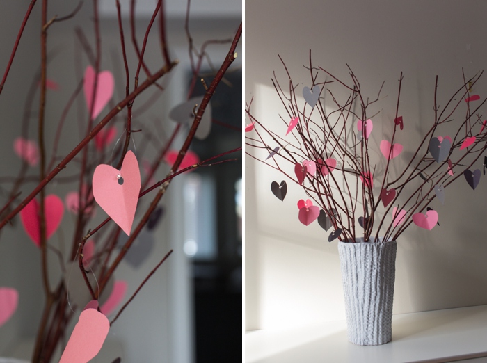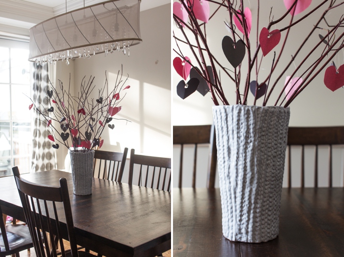 Arrange branches in vase (I had to trim some of mine down). Hang the hearts. You may need to make a few more depending on how it looks.