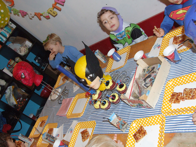 For drinks, I used some more of my comic book pages and simple wrapped organic apple juice boxes. A few kids wanted to know where Liam’s mom had bough these superhero juice boxes. Hmmm…maybe there is a business idea here…
