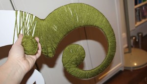 Finally: Make several smaller balls of wool from your skein. These are easier to handle when wrapping around the letter. Start by tying off on end of your ball of yarn and start wrapping. When you come to an end of a small ball, tie on another making sure to keep the knot on the backside of your letter.Wrap until you can not see any more foam core.
