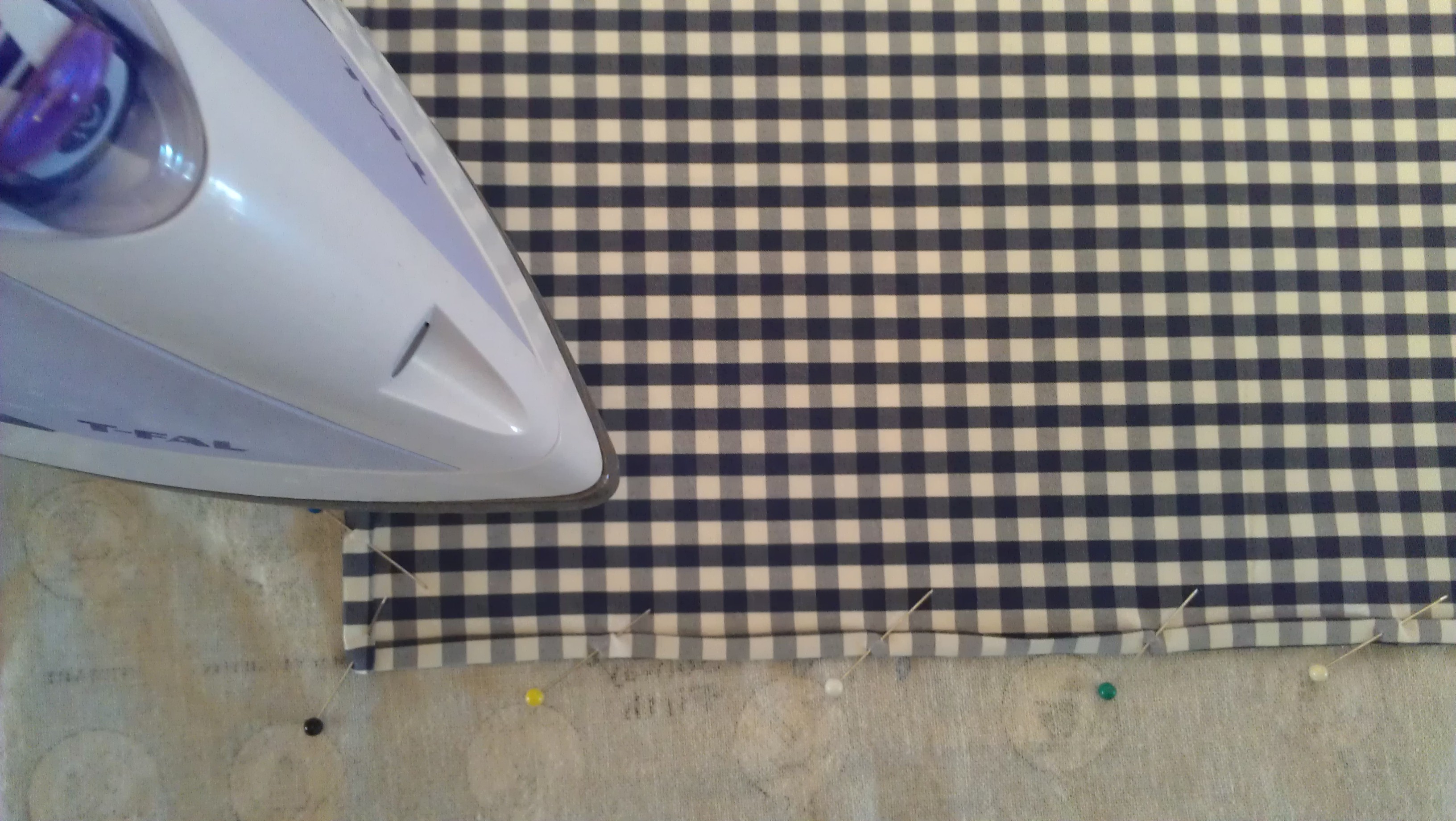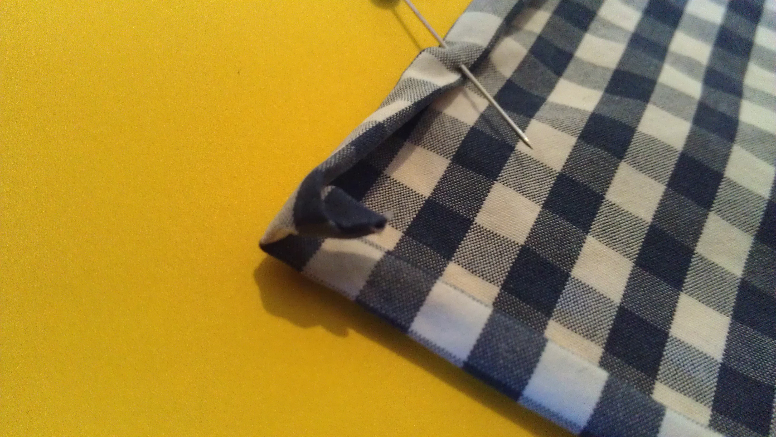 Just cut an approximate 12″ x 12″ square from the back of the shirt. If you’re lucky enough to be using a gingham shirt (which I was), you can fold each side over one square depth, then another and pin. If you’re not using a gingham shirt, fold 1/4″ and then fold another 1/4″ and pin.