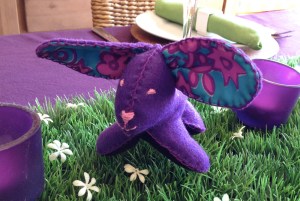 I like bunnies. Who doesn’t? I featured a bunny sewing project before on the ‘boards and am doing it again. A simple felt purple buddy this time to match my daring bold purple table setting.