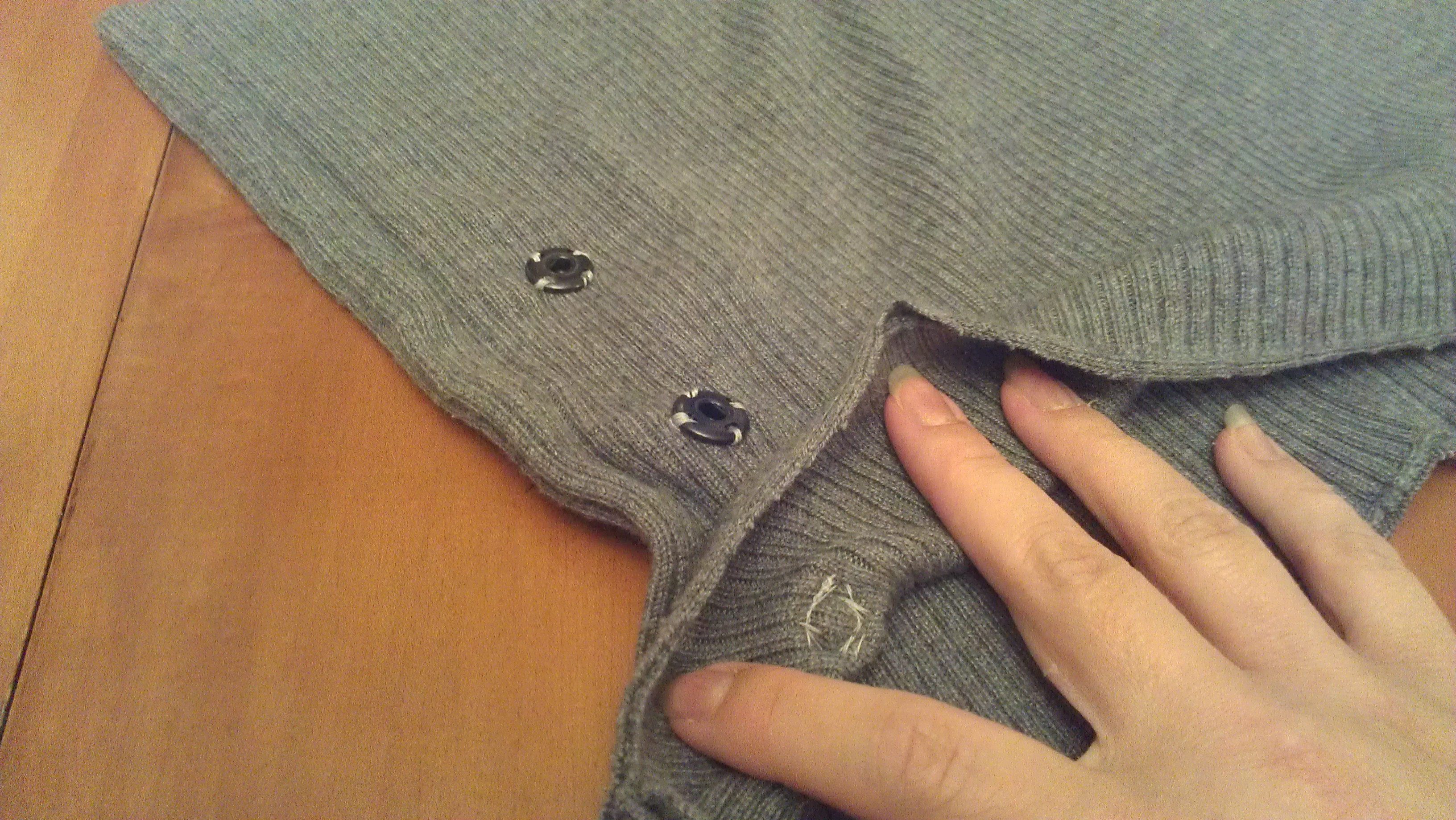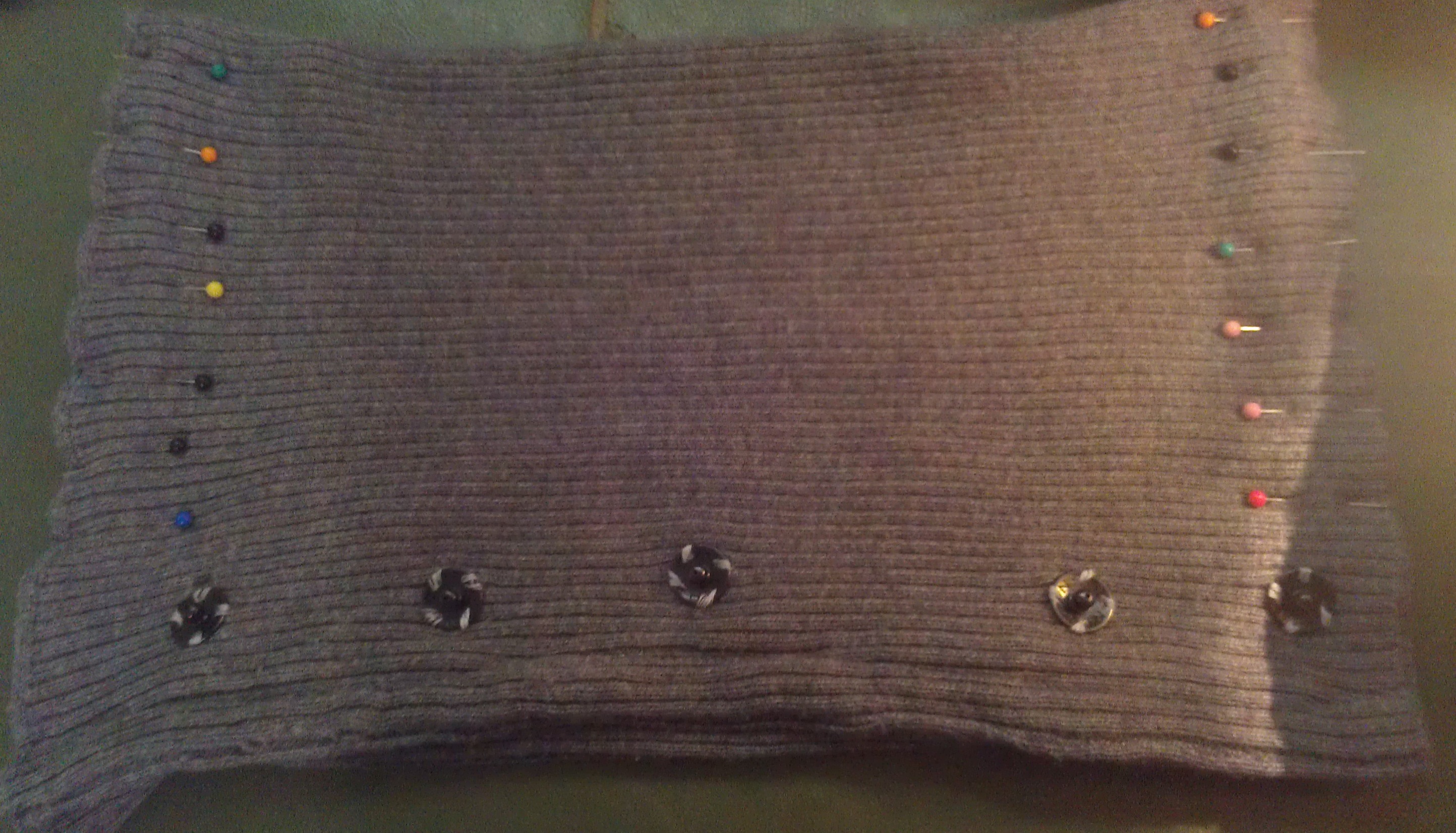 This grey sweater has a knitted, fitted bottom and sleeves and a loose top. Sadly, a sneaky little moth must’ve gotten into my closet, because there’s a hole or two where the top meets the knitted band. So, I decided to cut it off there and hem it to create a shorter sweater. And what to do with the rest of the material? Why, a purse, of course!