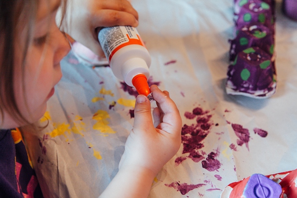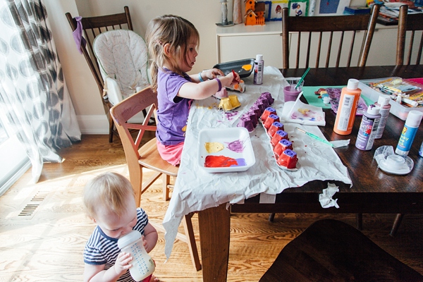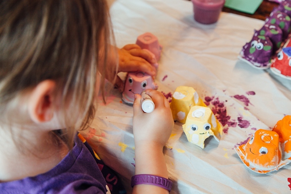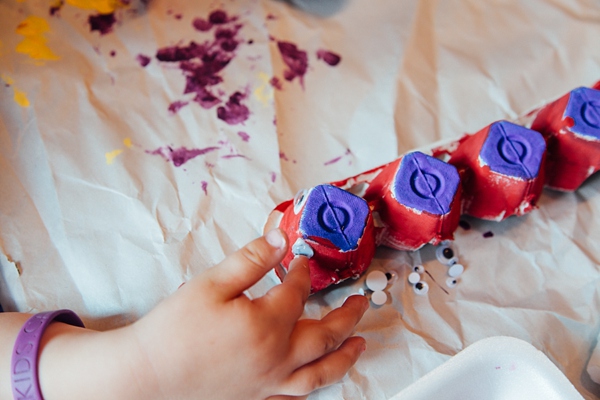Step 3: Pull out your paints or markers (or glitter glue, crayons, stickers, etc.) and decorate your caterpillars. Robin was intent on painting hers all the same colour (purple is her favourite) but I was finally able to convince her that it would be much easier to tell them apart if they were different colours. This was an excellent activity to take up time. Five caterpillars is a lot to paint so she even took a few breaks and then came back to finish her painting. Our paint dried fairly quickly, but you might have to use a blow dryer to speed it up if your little one is anxious to finish the craft.
