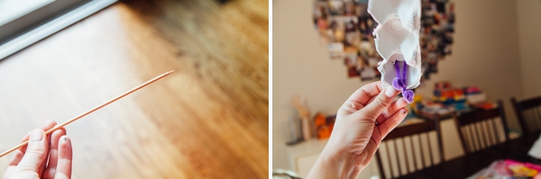 Step 6: Make antennas using pipe cleaners. I used a wooden skewer from the kitchen to poke holes through the caterpillars heads. The pipe cleaners were cut in half and then we could insert them through the holes. I made a knot at the bottom so they couldn’t be pulled back through again and then Robin made the loops at the top of the antennas. She chose purple for all the caterpillars and I gave up trying to argue.