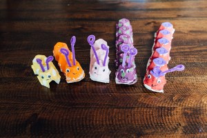 We let the glue and paint finish drying and Robin then spent the next week (yes, I’m serious, a week), playing with these caterpillars. She’s really into “families” right now so these were perfect for that and I have say that I like that she took a break from her dollhouse with its perfectly shaped, plastic family and got a little creative with these guys. I remember doing the same thing with my dad’s fishing lures when I was a kid (minus the hooks of course!).