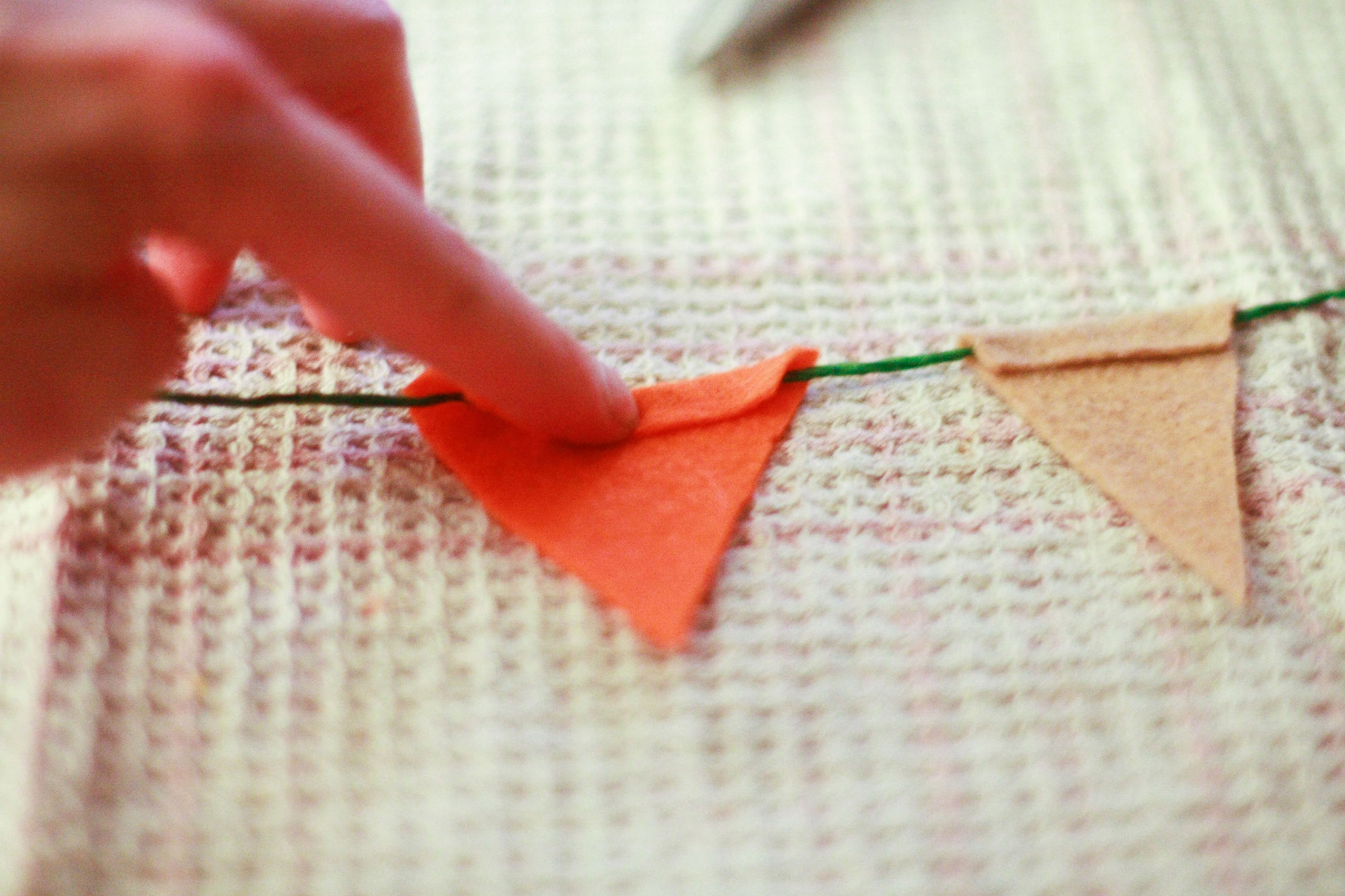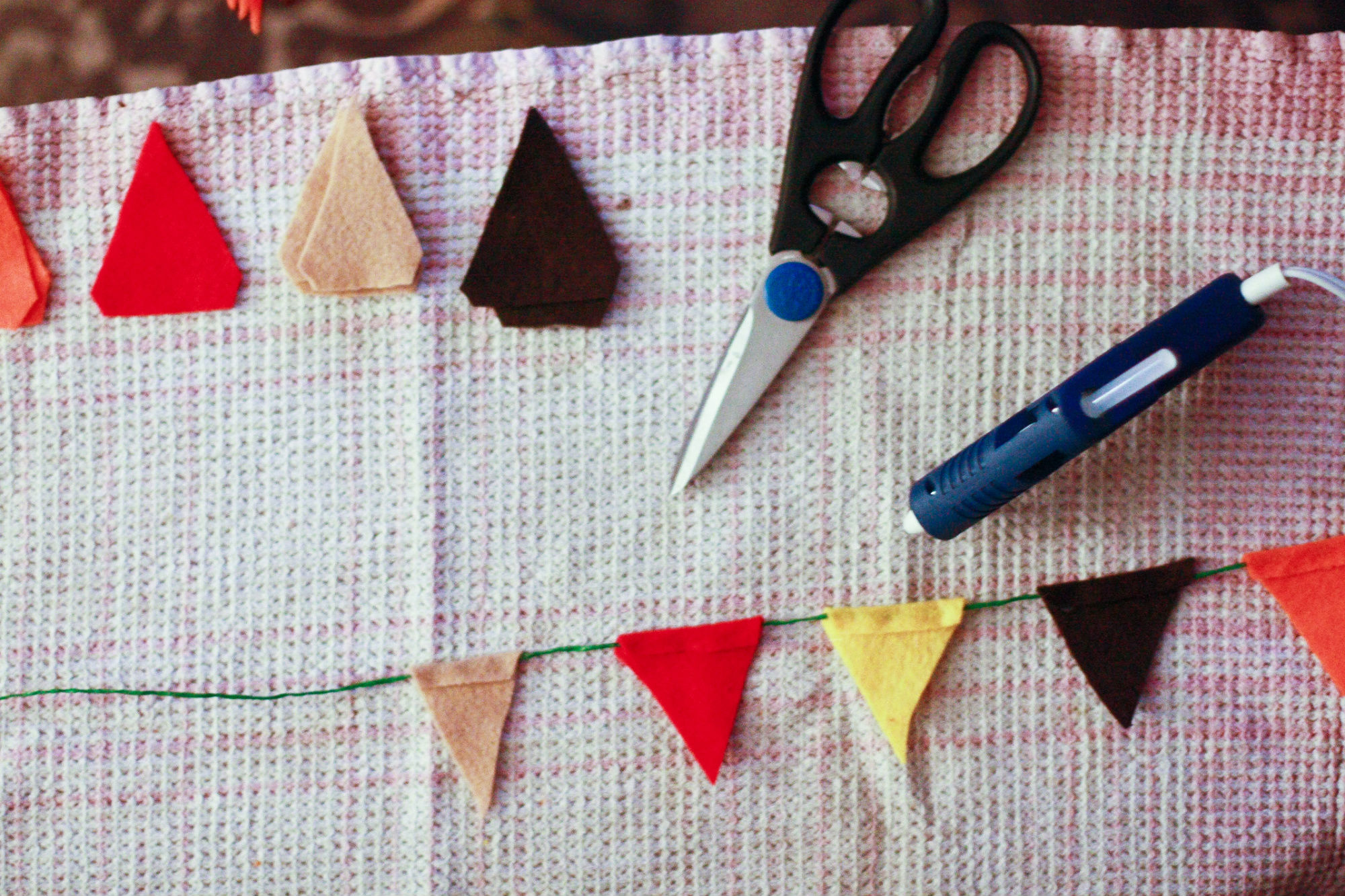 Next, line out your twine, heat up your glue gun, and get your felt triangles arranged in front of you. I recommend you do this over an old towel or tablecloth – the glue gun can get sticky.