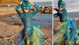 Be forewarned that I don’t have a pattern for this costume, but some common sense and half decent sewing skills should get you through. I purchased my material, felt, tulle and elastic from Fabricland, feathered mask from Amazing Party and Costume Store and the peacock feathers from Mid0co Art & Office Supplies.