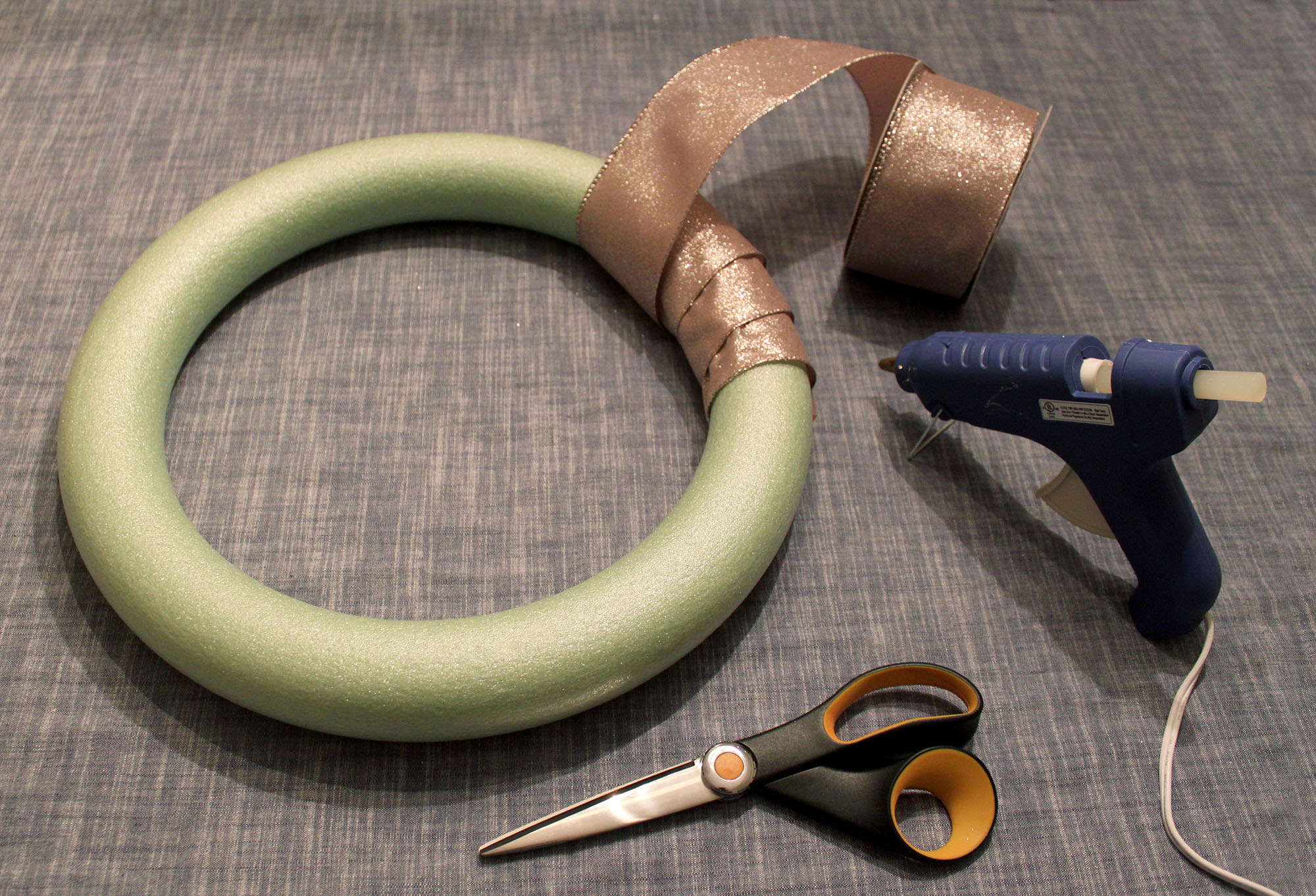 1. Begin by securing one end of your ribbon to the wreath with a small bit of hot glue. It’s best to apply the glue to the ribbon and then stick it to the form. Wrap your ribbon around the form, being sure to pull it tightly. Depending on how wide your ribbon is, you may need to overlap quite a bit like I did, but the wired edges were helpful for shaping it around the curves. When you’ve covered the entire form, cut the edge, fold under and glue in place. Set aside.