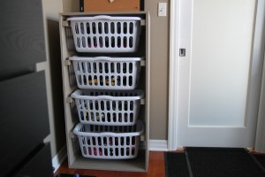 This simple project has worked out amazingly well. Even my 2-year-old knows to put her shoes away in her bin instead of leaving them on the floor!
