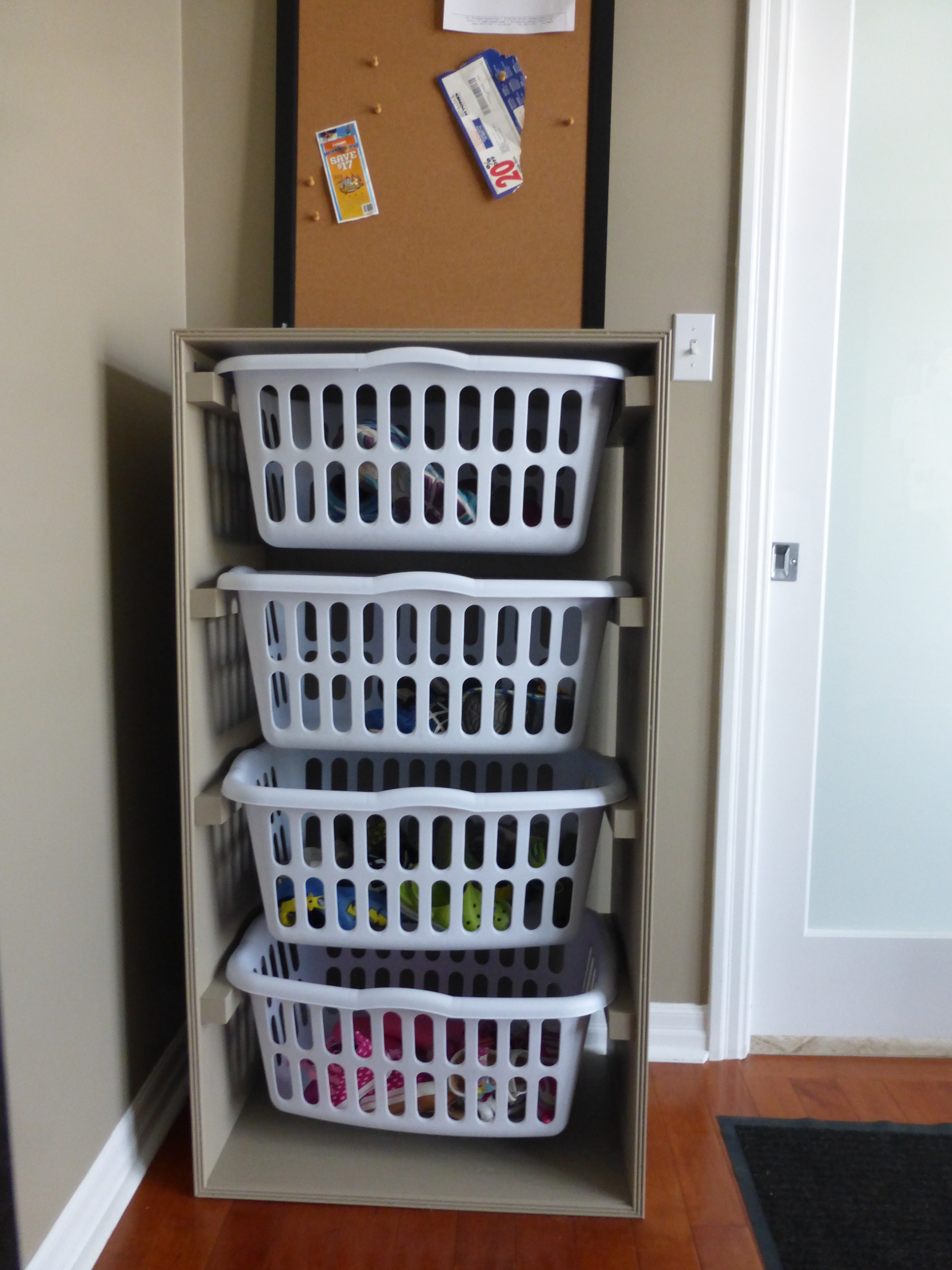 I modified an original Ana White plan ( http://ana-white.com Laundry Bin Stacker) in order to have a basket for each of my kids. I also used a laminated whitewood panel board instead of plywood because it is much cheaper and I didn’t have to wait around to have someone cut down the board for me.