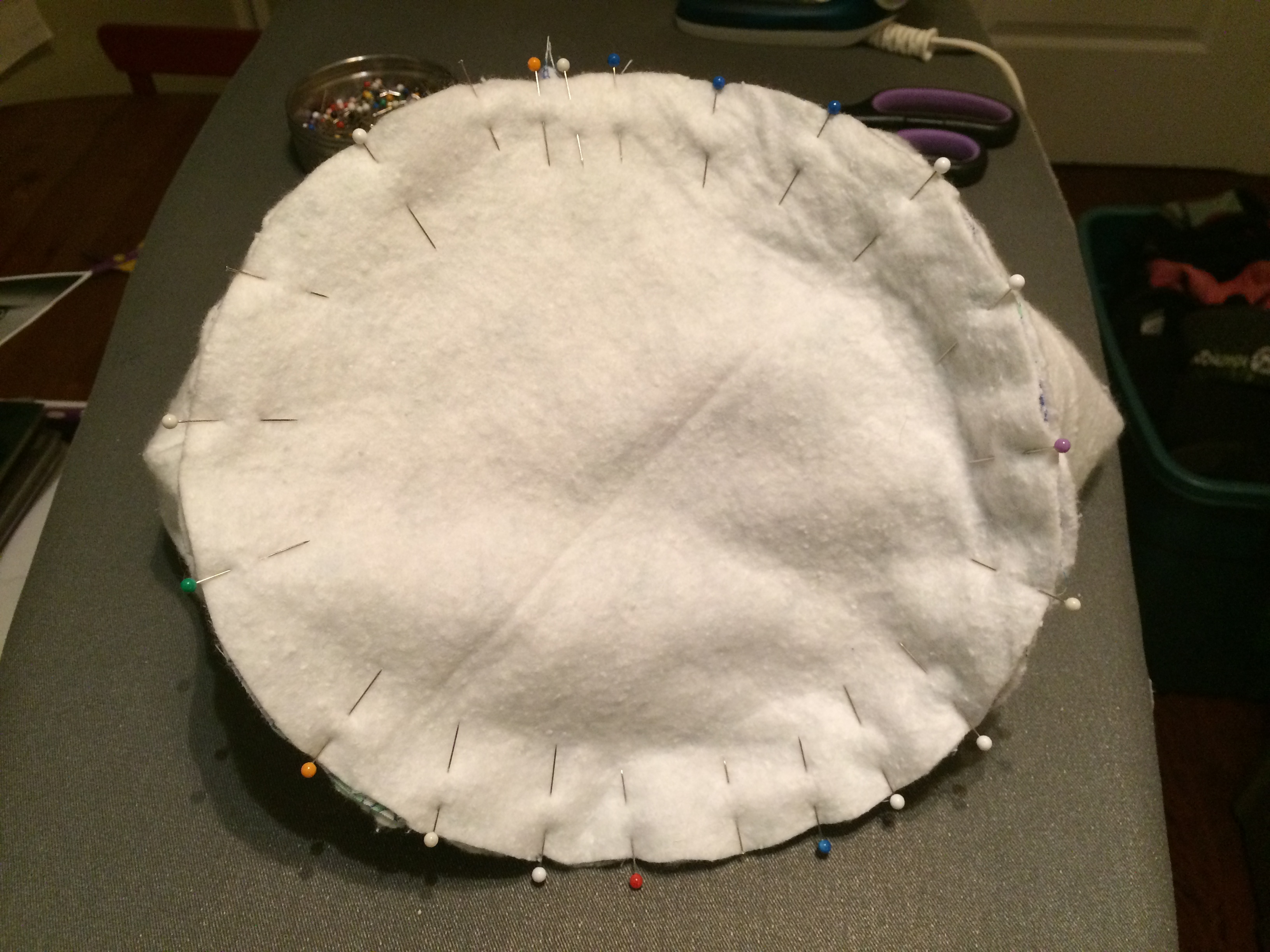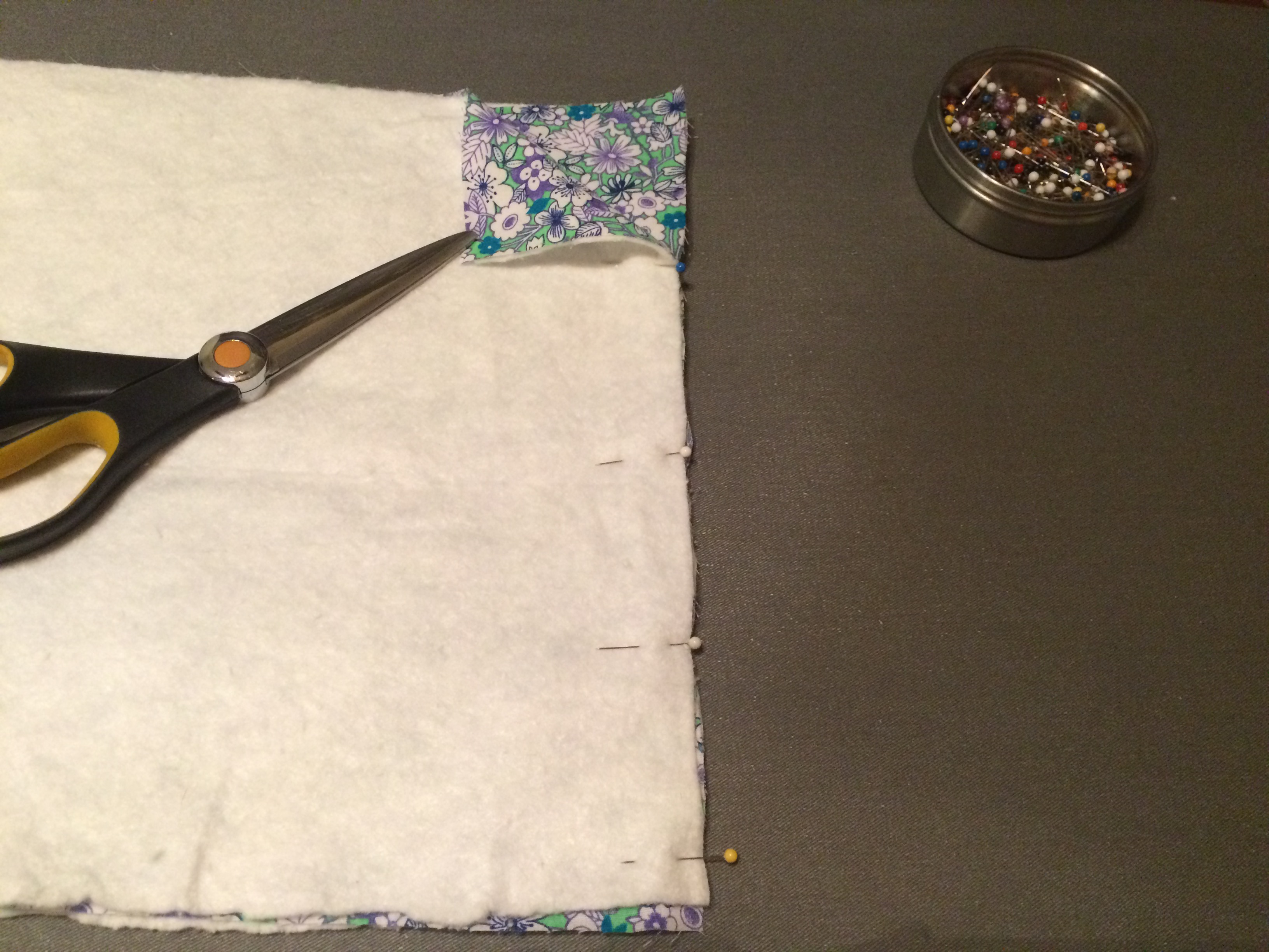 10. Once the fabric is pinned all the way around and seems smooth, sew with a ½ seam allowance around the base. Once complete, trim any excess seam allowance and press your seam upwards to the top of your basket.