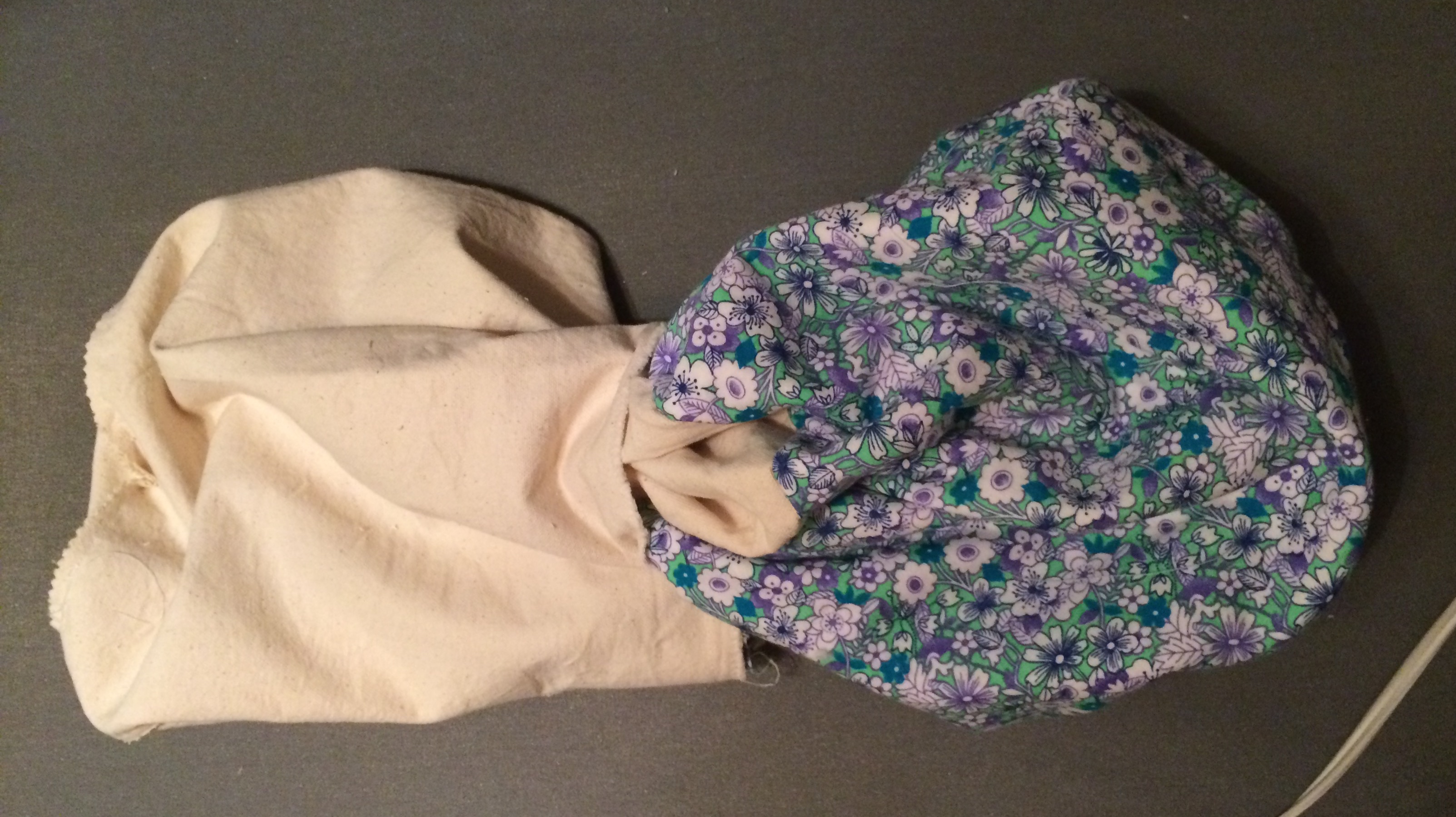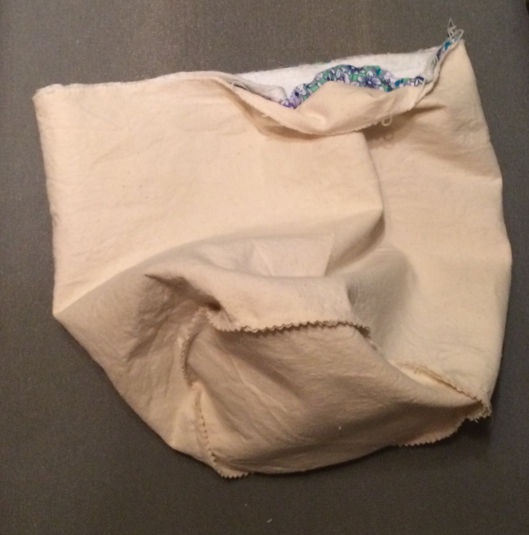 15. Once the top is sewn, use your opening to pull the outer fabric through. You should now have something like this. Press your seam allowance down towards the base of your basket. Press your opening in the same direction as well.