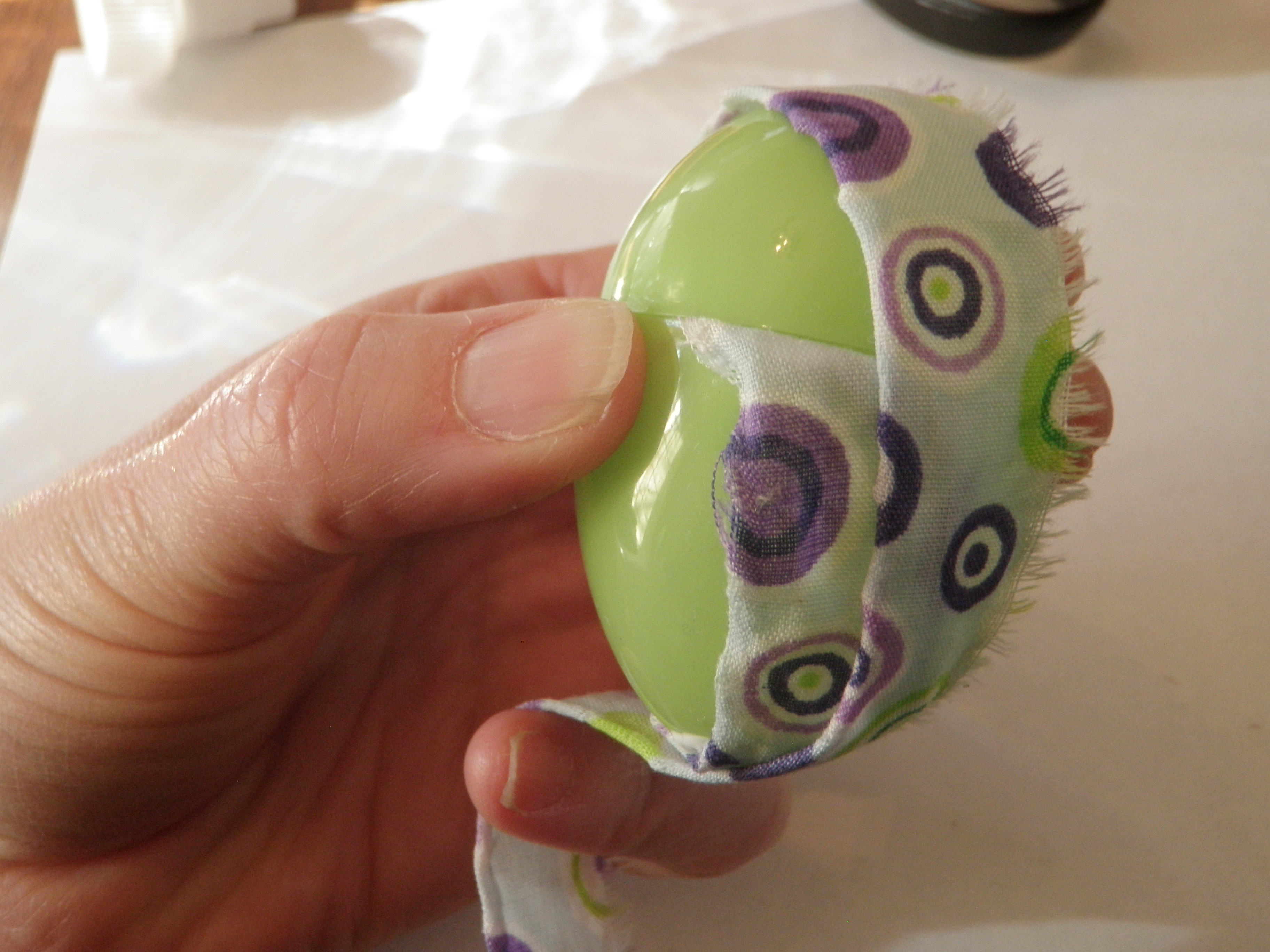 Once the egg is covered with fabric completely, snip off the excess fabric and glue the end down with plenty of glue.