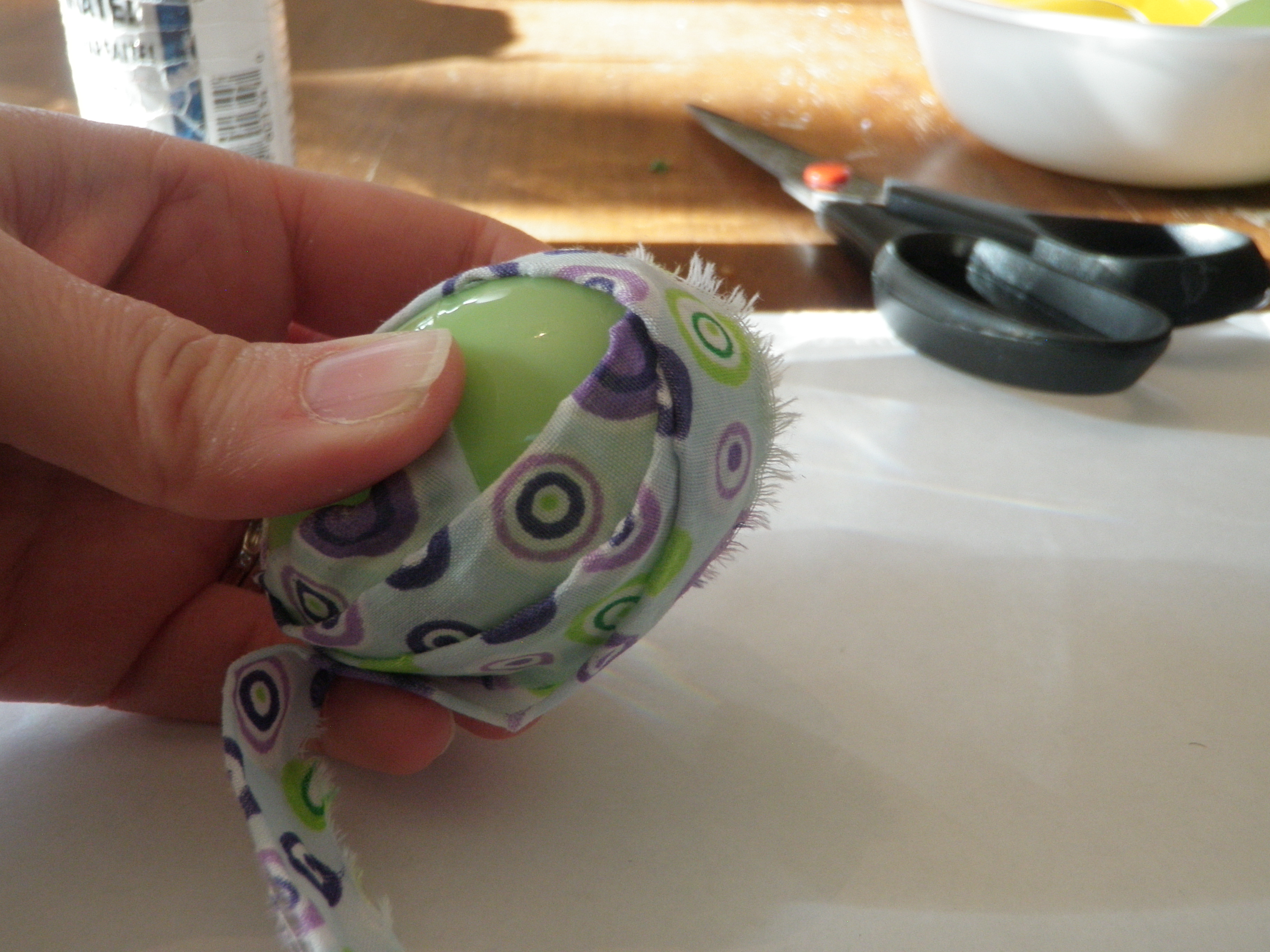 To begin, I cut strips of fabric. I found that for these eggs (they were slightly smaller than a real chicken egg) a strip about one metre long by one centimetre wide worked best. The strip that I used in the following pictures was a little too wide, and looked messier than the eggs with smaller strips. On those eggs with which I used a thin cotton fabric, I started by putting the fabric end inside the egg on some glue. If you are using eggs without an opening, just use more glue!