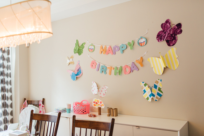 Last spring, I was looking for a craft to do with my then 3-year old Robin. We decided to make large painted butterflies and I thought it would be fun to hang them off the ceiling in her bedroom. While the crafting went very well, when it came time to hang the butterflies, Robin freaked out and was terrified of having them hang from the ceiling. They seemed too pretty to just throw out so I stuck them in the cupboard hoping to use them at some point later. Fast forward 6 months to October – in the midst of planning a co-birthday party with her friend, I remembered the butterflies and they turned out to be great party decor. They also would have been a great birthday party or play date craft.