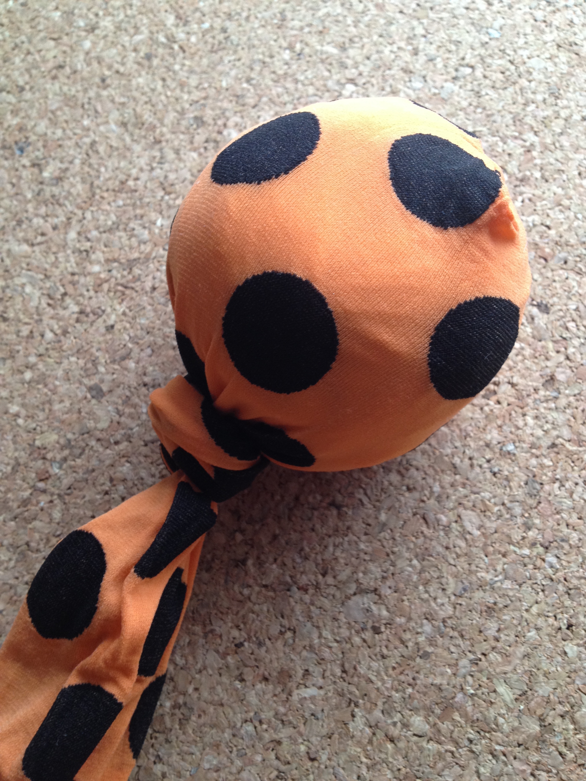 Next, it’s time dress up those yarn balls in pantyhose. To prevent the balls from sticking together and wool fluff getting all over your machine, it’s best to protect them this way. This is a great way to recycle those stockings with runs in them, or find a use for strange halloween tights like mine below! Cut off one leg of the pantyhose and push a yarn ball all the way to the toe. Tie in a knot close to the ball. Repeat if you are making several dryer balls.