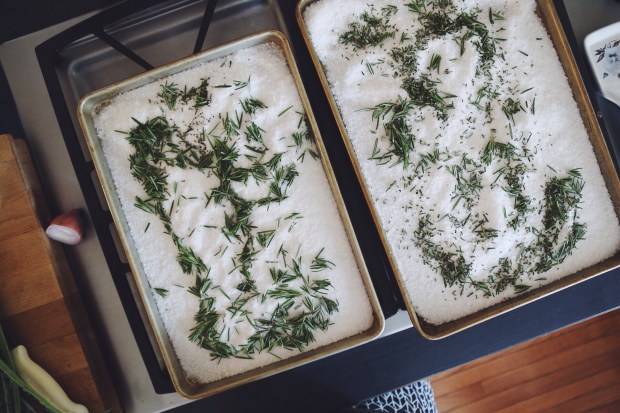 Put your salt on the baking sheet and sprinkle the rosemary on top — mix in a little, but don’t worry too much about blending it at this stage.