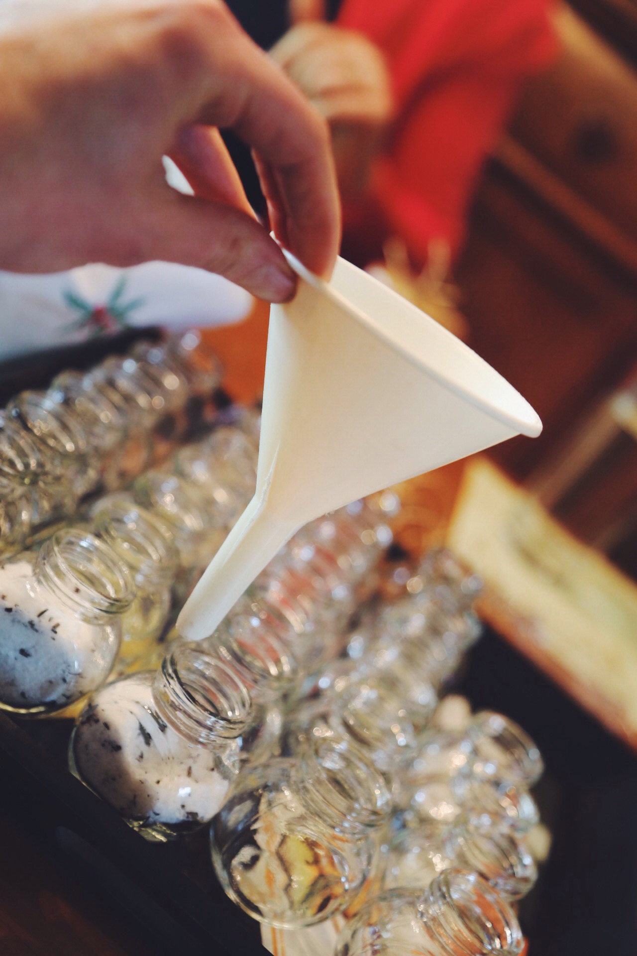 Using the scoop and funnel, fill the jars about 90% full — we liked the look of a little space at the top.