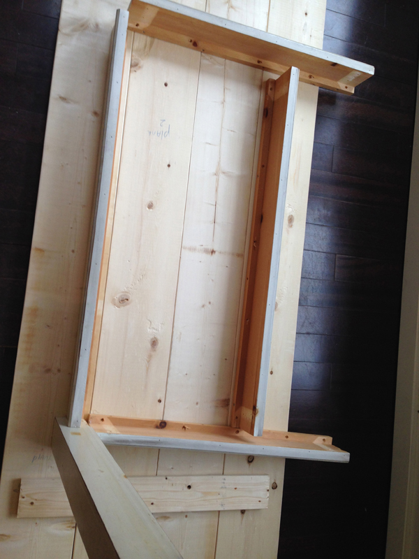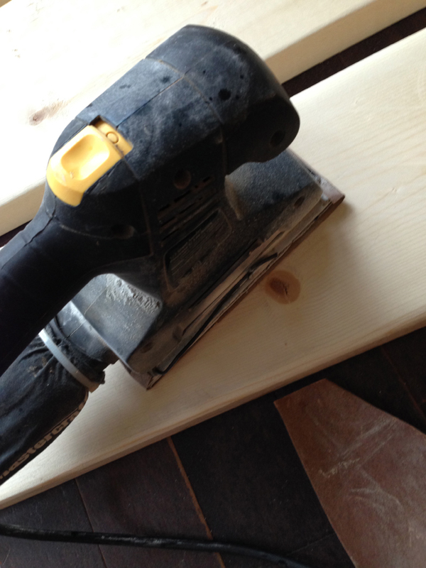 I got pine wooden planks at Home Depot (1”x 8”x 12′) and got them cut in the middle there for free, getting me 4 perfect 1x8x6 planks. I also got some ½” thin planks cut to 28” to cross my main planks on the bottom. I used the sander to do a good sanding job.