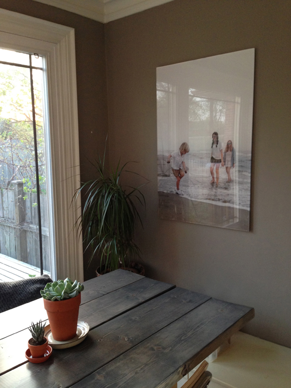 One of my favourite parts of the new nook is the photo of my kids. I made this photo last year in the most southern part of the Camarque, in the French Provence. A very unusual beach scene…steam came of the water and the colours of sand, sea and sky all blended together in a really pretty, de-saturated way. I did some very minimal colour adjustments on the photo (slight additional de-saturation). I wanted the photo to be displayed as is…simple. Something without any frame but with a quality and substance to make it look more art versus “family pic on the wall.” I had Blacks put it behind a ¾” acrylic top and it turned out amazing. Warning: the acrylic is very heavy so make sure to hang this kind of thing well (double screws, heavy duty, plugs etc – there are lots of options out there right now at your hardware store…just check and know your wall: is there a place you can put your screw into a support beam, is it straight on the weaker part of dry wall, etc).