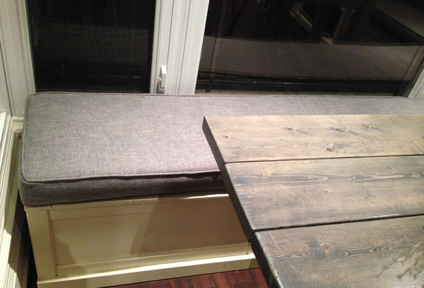To make the benches more comfortable but also higher (remember the table is almost counter height), I added bench pillows. This was going to be a custom job and a big one as the longest side of the bench is 104 inches. I considered doing it all myself but when I investigated the costs for high-density 5 inch foam online, things became super pricey. When I visited my fave fabric warehouse in Toronto’s Junction, the lovely ladies there quoted me on the highest quality foam, plus some really nice gray fabric and getting it all made (incl. piping, zippers etc) and the price came close to the “foam only” price I found online. This total custom job got to around CN$350, which really is a steal. The best part? I like to DIY and sew but this job would have been a big and advanced sewing job for me and I would have never been able to do it this professionally.