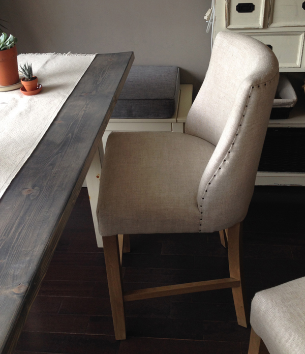 I bought the perfect counter chairs at RH. I would have preferred the ones with the dark legs but that would have been 8-week delivery time. These were delivered within a week but had the weathered oak legs and the oatmeal-coloured fabric which were not my first choice but nevertheless totally work. They were discounted but still US$309 per piece. Hey….I basically saved $1000 on making my own custom table, so this is how I rationalize the chairs.
