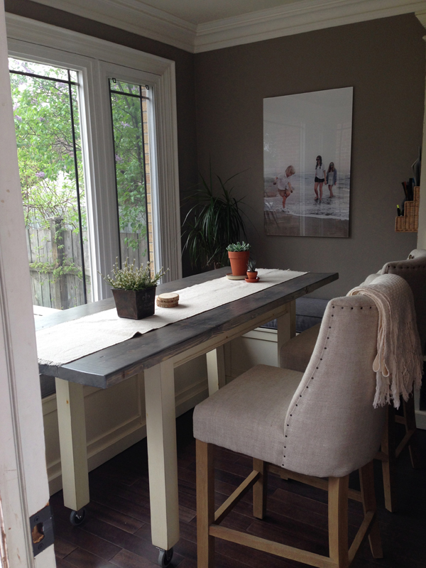 I wanted a higher table (counter height), something harvest-style but unique. I also wanted the shape to fit the nook much better, meaning less width (30”) and much longer (6 feet). The final “must” were table legs which would not hinder sitting down and getting of the benches. We were always knocking our knees into the current legs, located on the outer corners of the table. I decided to make a new top from scratch (wooden planks) and modify the legs to completely narrow the frame (positioning the legs away from the edge of the table). The height issue was solved with metal casters, adding a good 4 inches.