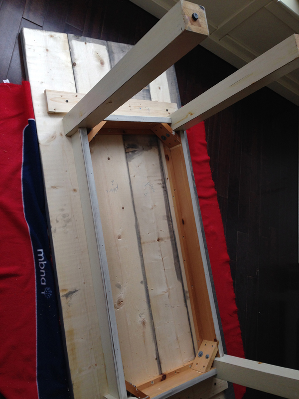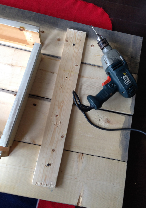 Next: assembly. I did all assembly on top of an old fleece blanket to make sure my perfectly sanded and stained planks would not get scratched or dented in any way. I used the smaller cross planks and attached them to my planks (first ensure to line up the planks perfectly). Always pre-drill holes or your wood will crack.