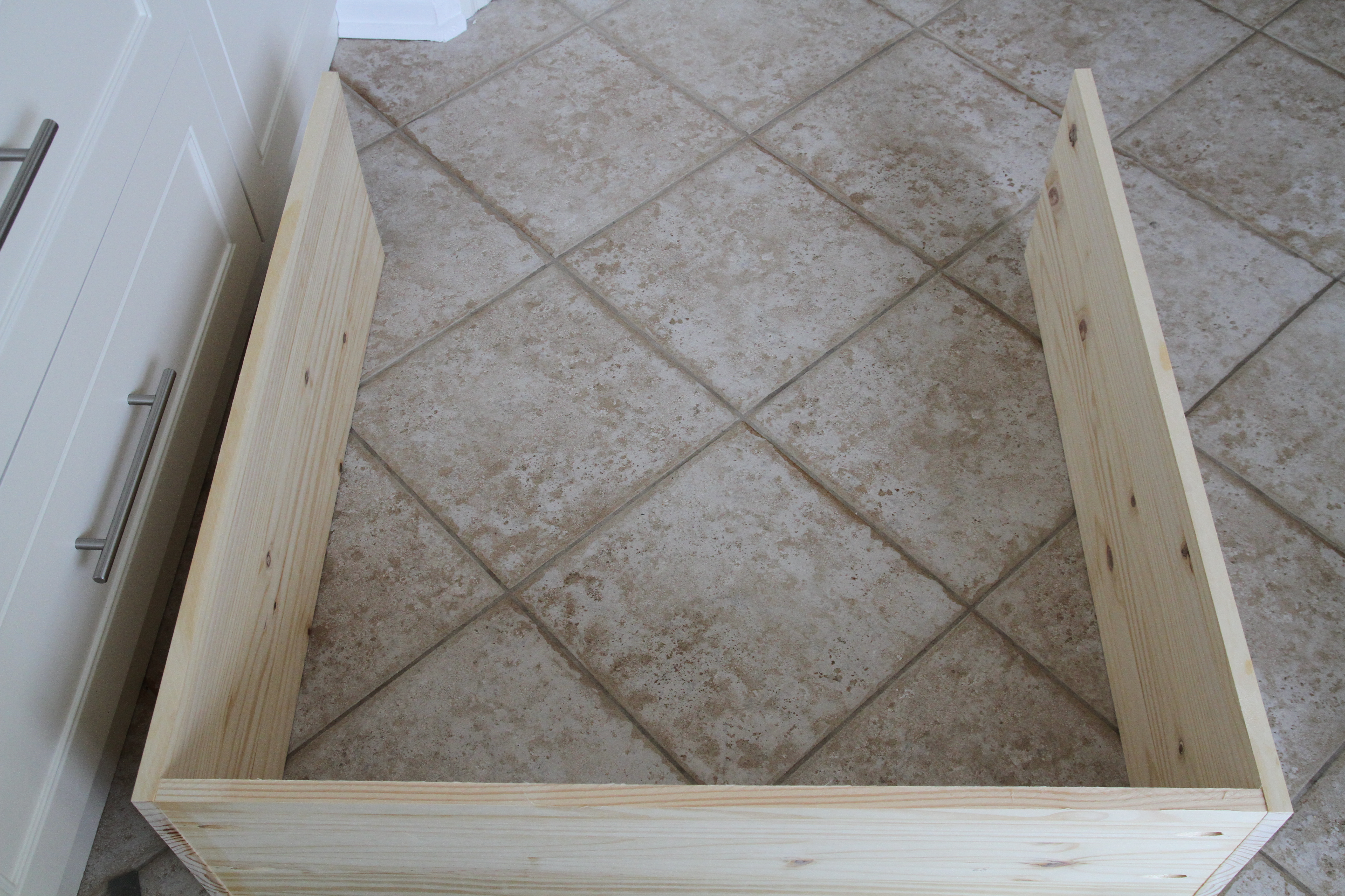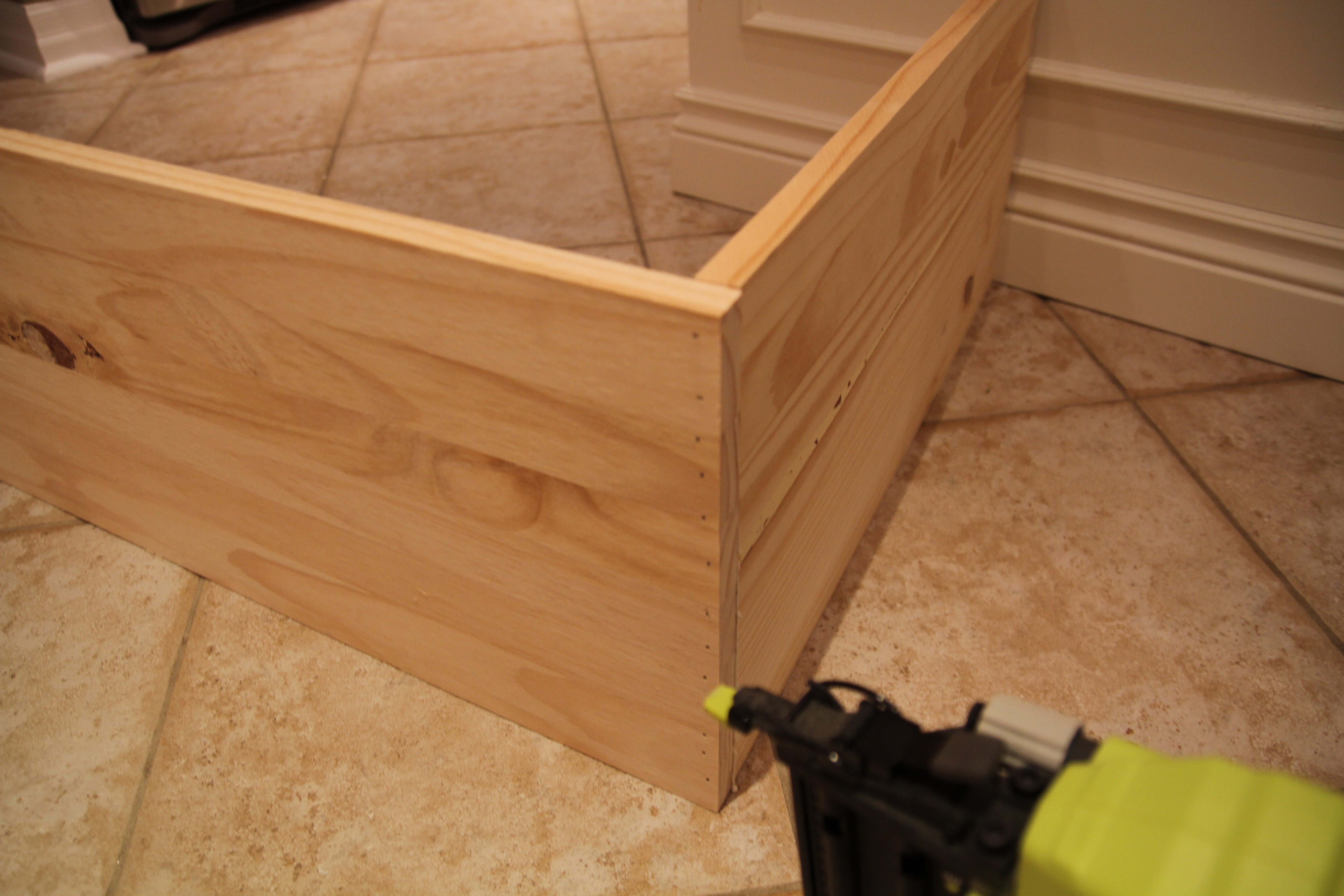 8. Cut hardboard panels to the dimensions of each floor, and attach with glue and 5/8” nails. I measured from the back, and had the backing meet up to half the width of the floor board, so that I had room to have the second back panel attach and have room to nail into the floor running horizontally along the back.